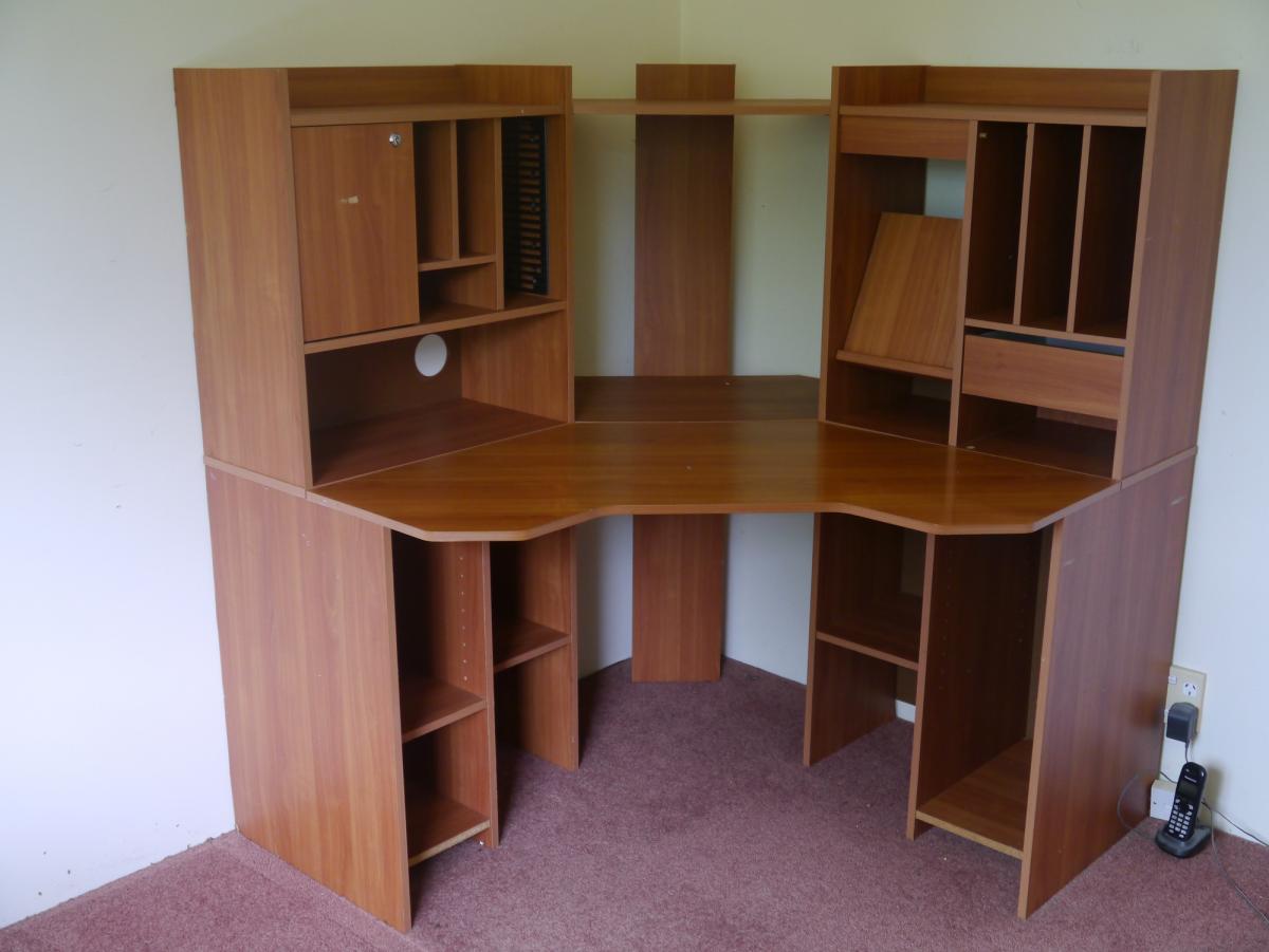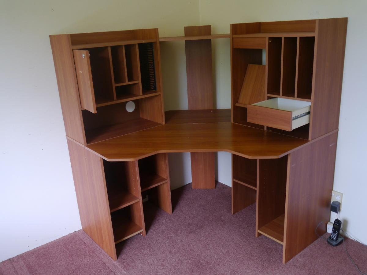 Our home office is getting a makeover and redesign so this desk is surplus to requirements. Customwood construction, in fair condition with the odd scuff in places. Measures 1240mm each way from the corner and top shelf is at 1310mm height. The cabinets on either side detach from the central … View moreOur home office is getting a makeover and redesign so this desk is surplus to requirements. Customwood construction, in fair condition with the odd scuff in places. Measures 1240mm each way from the corner and top shelf is at 1310mm height. The cabinets on either side detach from the central shelves and upright and the main work surface comes off too. Disassembled it will fit in a medium sized station wagon or SUV. Pick-up from Waiongana SH3A, Inglewood area. DM for our address and other details.