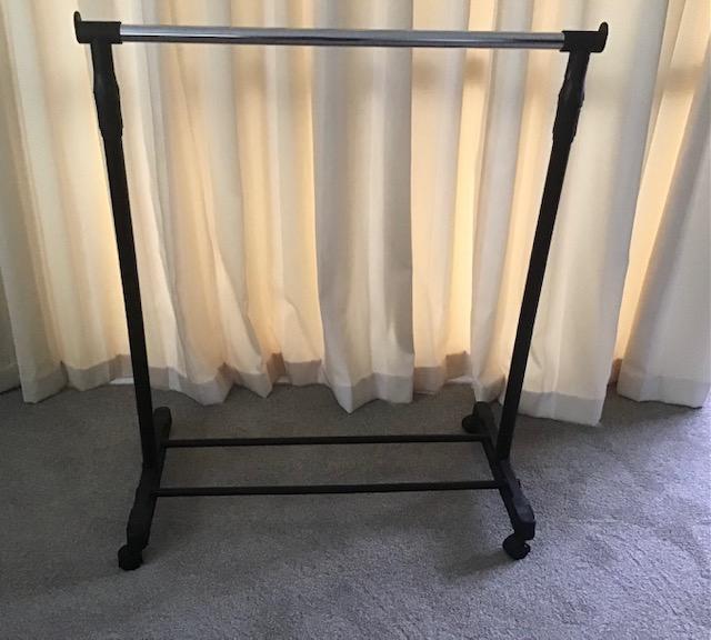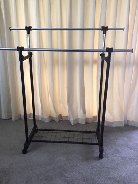 Selling two as new clothes racks. One has one rail. the other has two and a shelf. Bothe on casters.