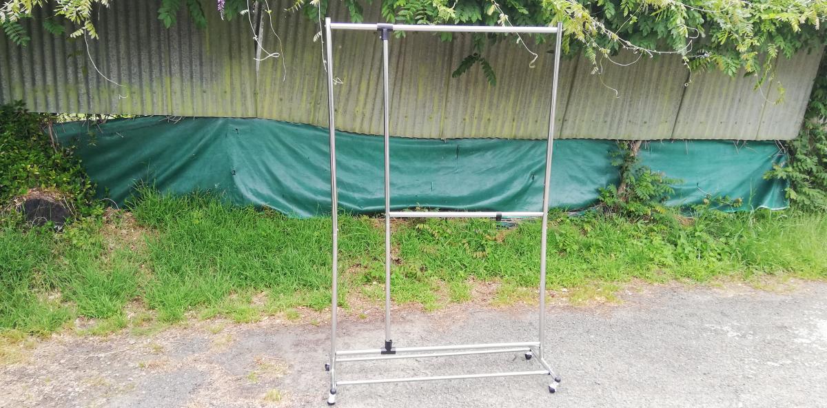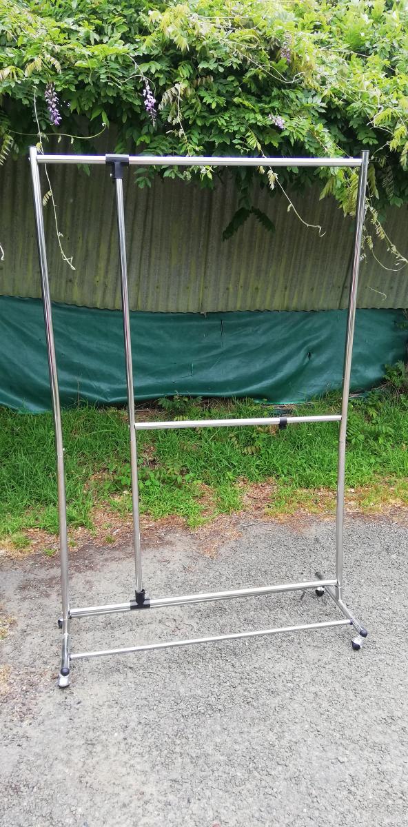 As new. Sturdy clothes rack that does not fall apart when clothes weight is applied. It is adjustable, is on wheels and it also comes apart.