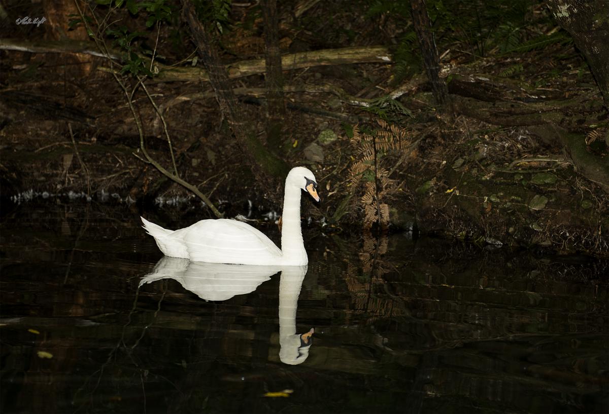 Mute Swan. Note the interesting parallel, horizontal lines on the swan. I suspect they might be created by reflections from the ripples on the water surface. Please enlarge.