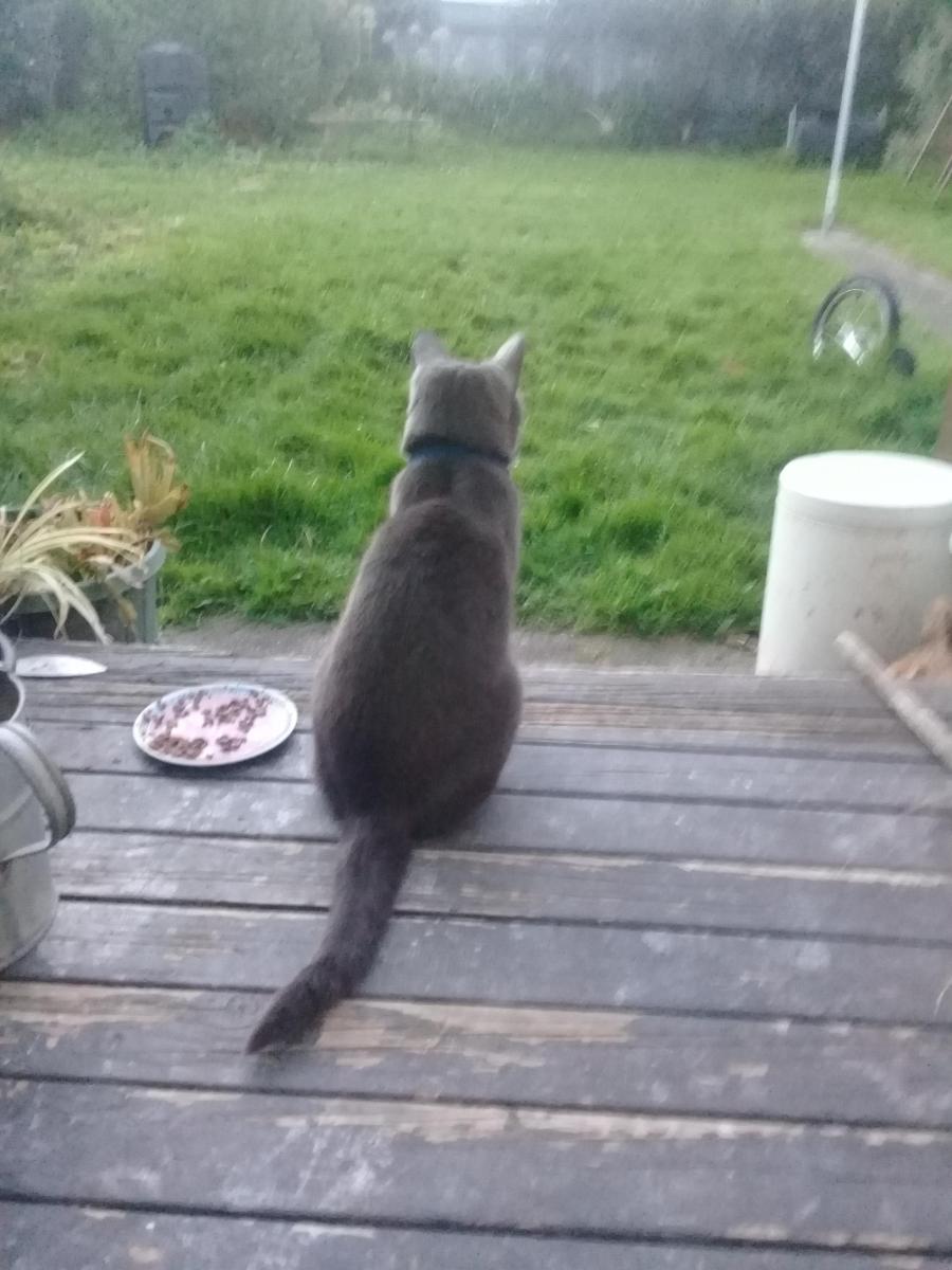 I will try to get a front view photo when he comes to eat our … View moreThis wonderfully friendly grey cat has been wandering around Terrace End for over a week. I took him to SPCA yesterday but no I.D. Chip.
