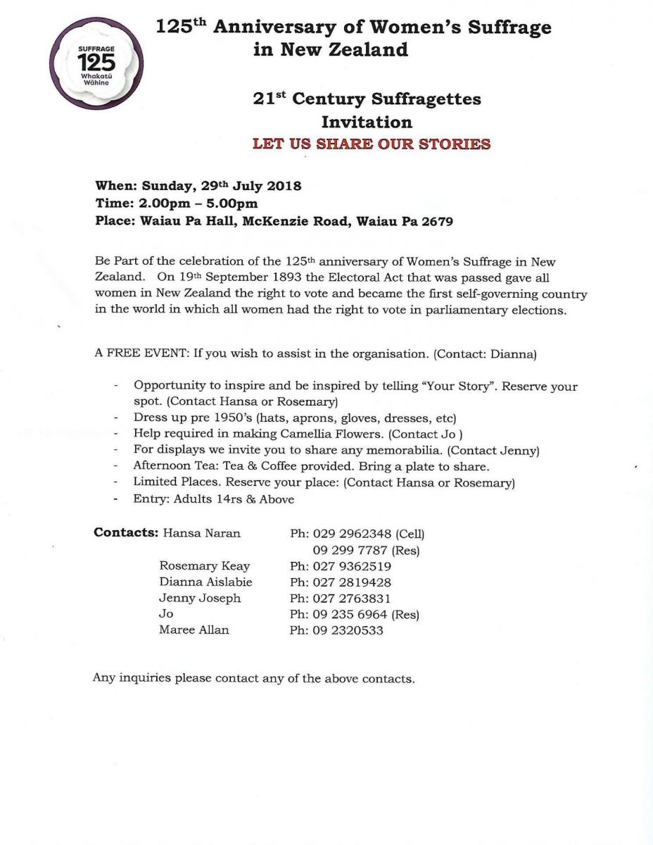 We are holding a day to celebrate 125 years of Sufferage in NZ.