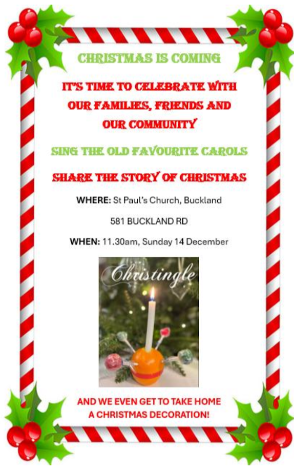 11.30am, Sunday 14 December: Share the story of Christmas with family, friends and community at this "Christingle" service. St Paul's Anglican Church, just by Buckland School. All Welcome!