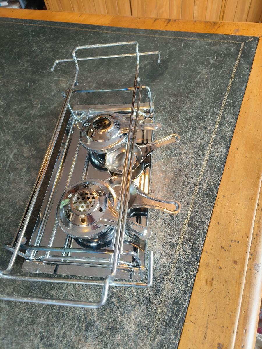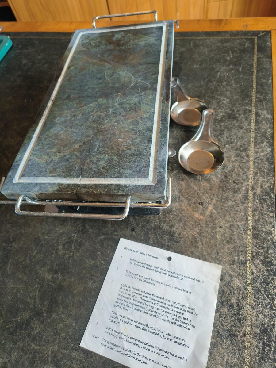 Bought new in Australia … View moreThis Original Hot Stone Cooking Set includes a 14.5" x 7.5" Hot Stone with a groove milled into the outer edge to help prevent liquid run-off, a chromed wire oven holder, a chromed wire stand, a stainless steel tray, two chromed alcohol burners and instructions.