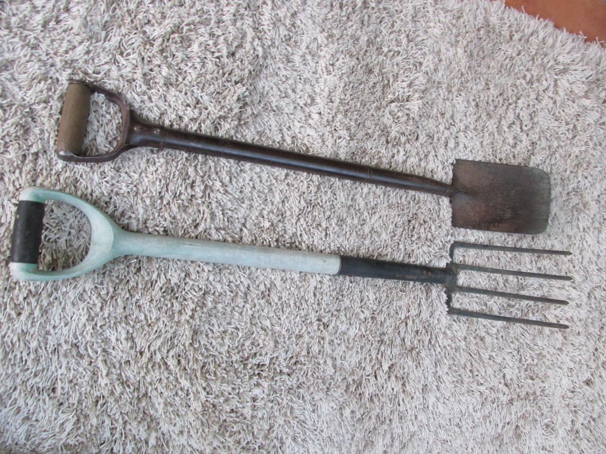 Offering a garden fork & a spade. tidy condition. the wooden handle on the spade is a little loose and rotates, but it works.