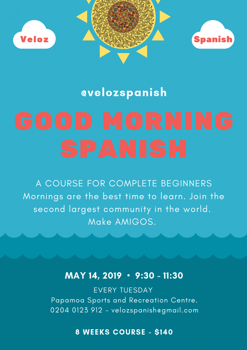 A new Complete Beginners Spanish course will start next week at the Gordon Spratt Sports and Recreation Centre in Papamoa. We have more energy early in the morning, it is the perfect time to learn something new. Veloz Spanish courses are designed to learn to speak … View more*** Few spaces still available