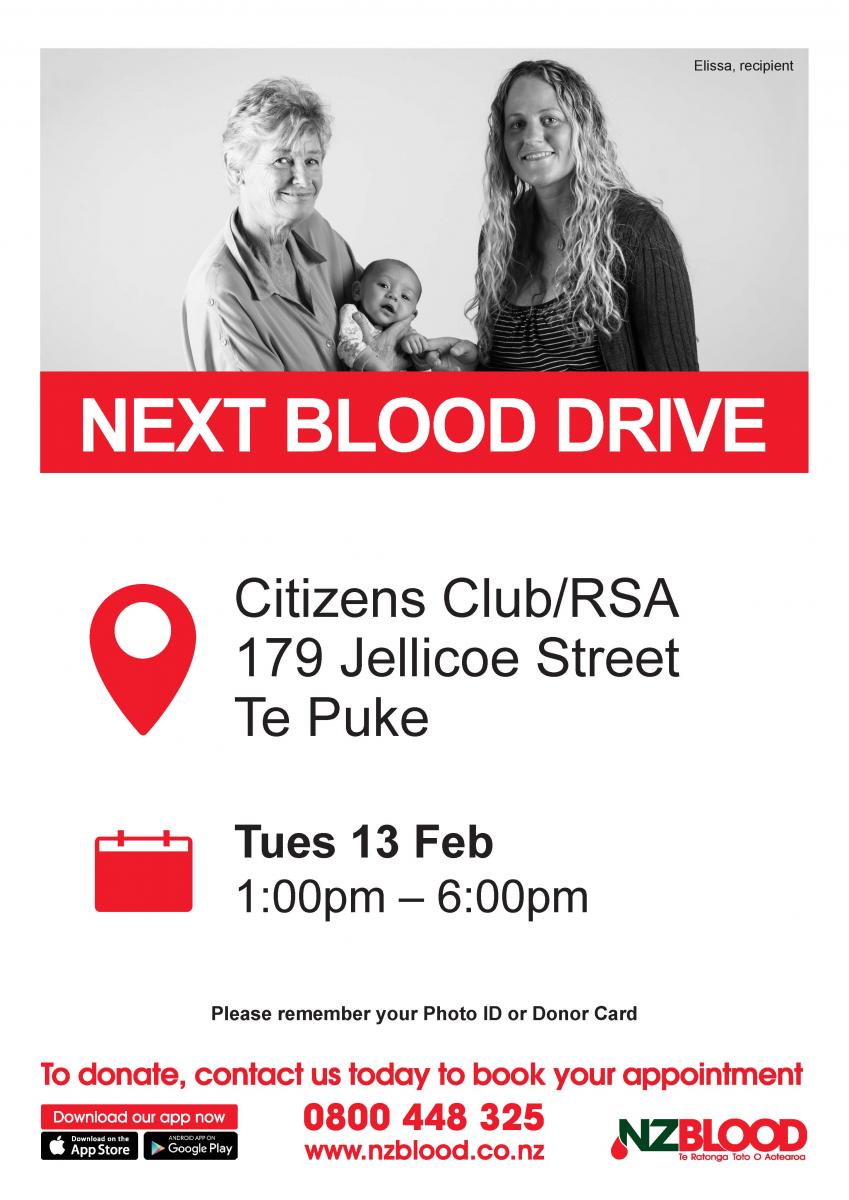 Don't miss your chance to Save a Life! Head along to the RSA/Citizens Club in Te Puke on Tuesday 13th February between 1pm and 6pm to give blood.