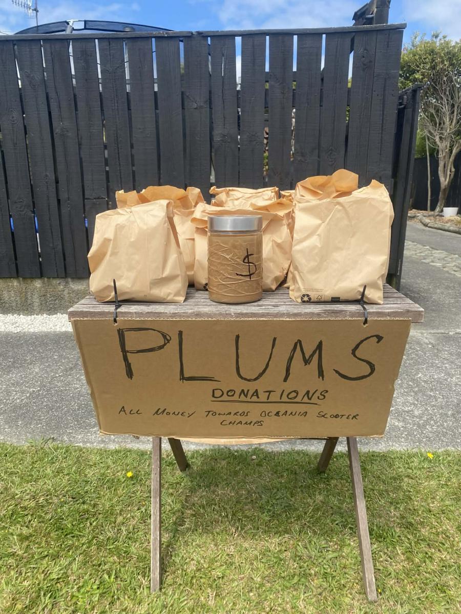 Plums outside 15 Park Ave, Waikanae. Fundraising for our son for Oceania scooter nationals in Napier. 18 plums to a bag, pay what you like, theres a jar for donations. They have been washed and are good to go. Still have plenty left on the tree also if you're interested. Cheers everyone