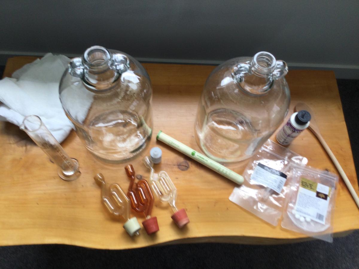 2 x glass Demi John’s, Hydrometer, airlocks, Star San (sanitizer) & other bits & pieces.