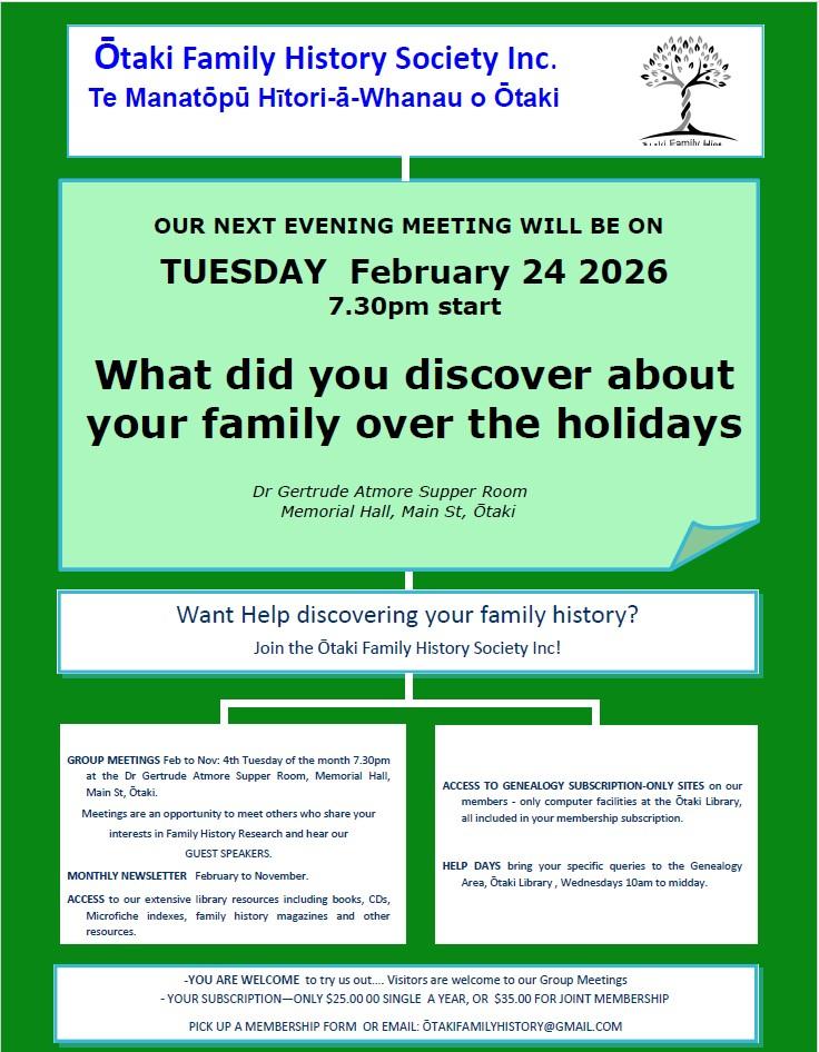 Otaki Family History Society Monthly Meeting