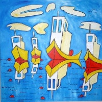 Painting in the window Artist Vincent Duncan Fishing Boats, Oil, at Artel Gallery Shop 3, 6 Mahara Place, Waikanae Shops...