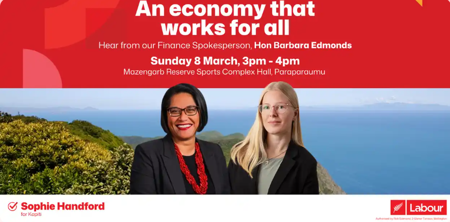 FYI, there is a public meeting this weekend in Paraparaumu with our Kapiti Labour candidate Sophie Handford and Labour finance spokesperson Hon Barbara Edmonds. I hope to see you there! RSVP required on humanitix (free):