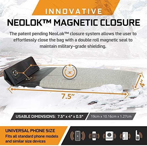 Made with extremely durable & waterproof outer materials to ensure that devices & the faraday liner stay dry & protected. The interior includes two layers of high-shielding TitanRF™ Faraday Fabric on all sides with dual paired seam construction. The bag opens & closes easily using the NeoLok™ closure (a double roll plus neodymium magnetic seal). Devices enclosed inside are guaranteed to remain dry & offline in any water-surrounded location.