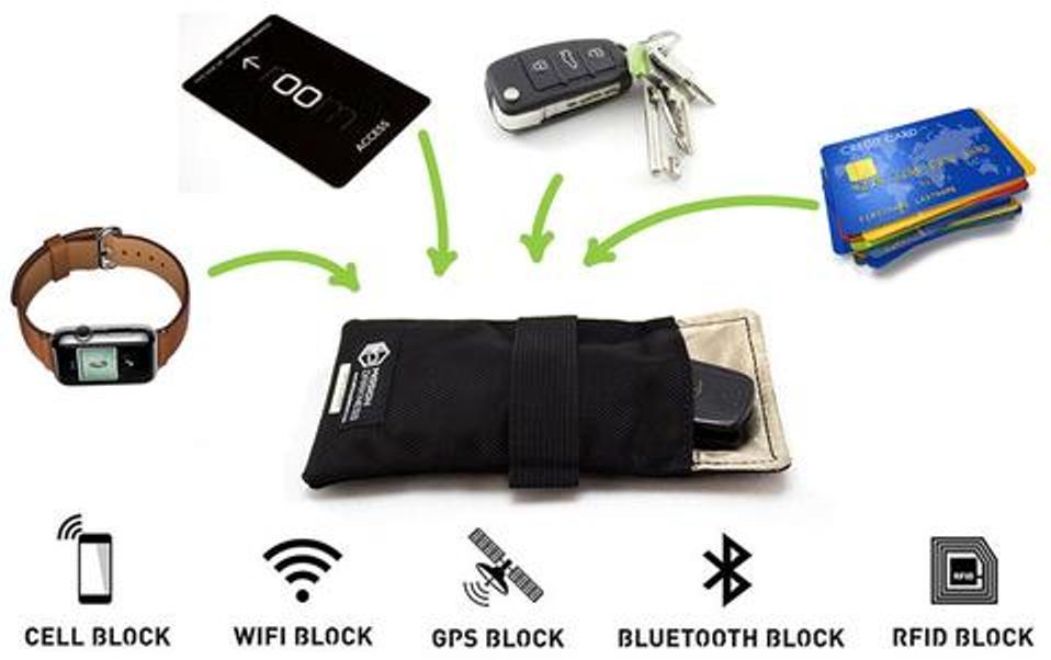 Shields tablets, small laptops, cell phones, transponders, key fobs, cameras, smart watches, transmitters, GPS units, two-way radios etc