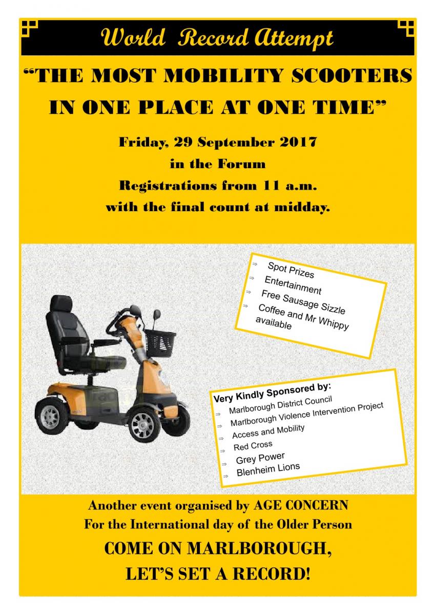 This Friday, Age Concern Marlborough are holding a World Record challenge, for the Most Mobility Scooters in One Place at One Time! Registrations from 11am, the final count at 12 noon, in the Forum. If you can't attend, but have a mobility scooter we could borrow then let us know by Thursday … View moreThis Friday, Age Concern Marlborough are holding a World Record challenge, for the Most Mobility Scooters in One Place at One Time! Registrations from 11am, the final count at 12 noon, in the Forum. If you can't attend, but have a mobility scooter we could borrow then let us know by Thursday lunchtime and we can pick it up. Hope to see you there!
