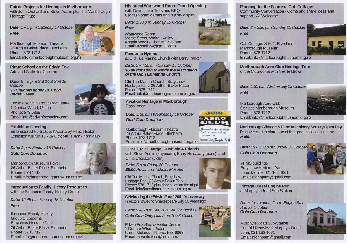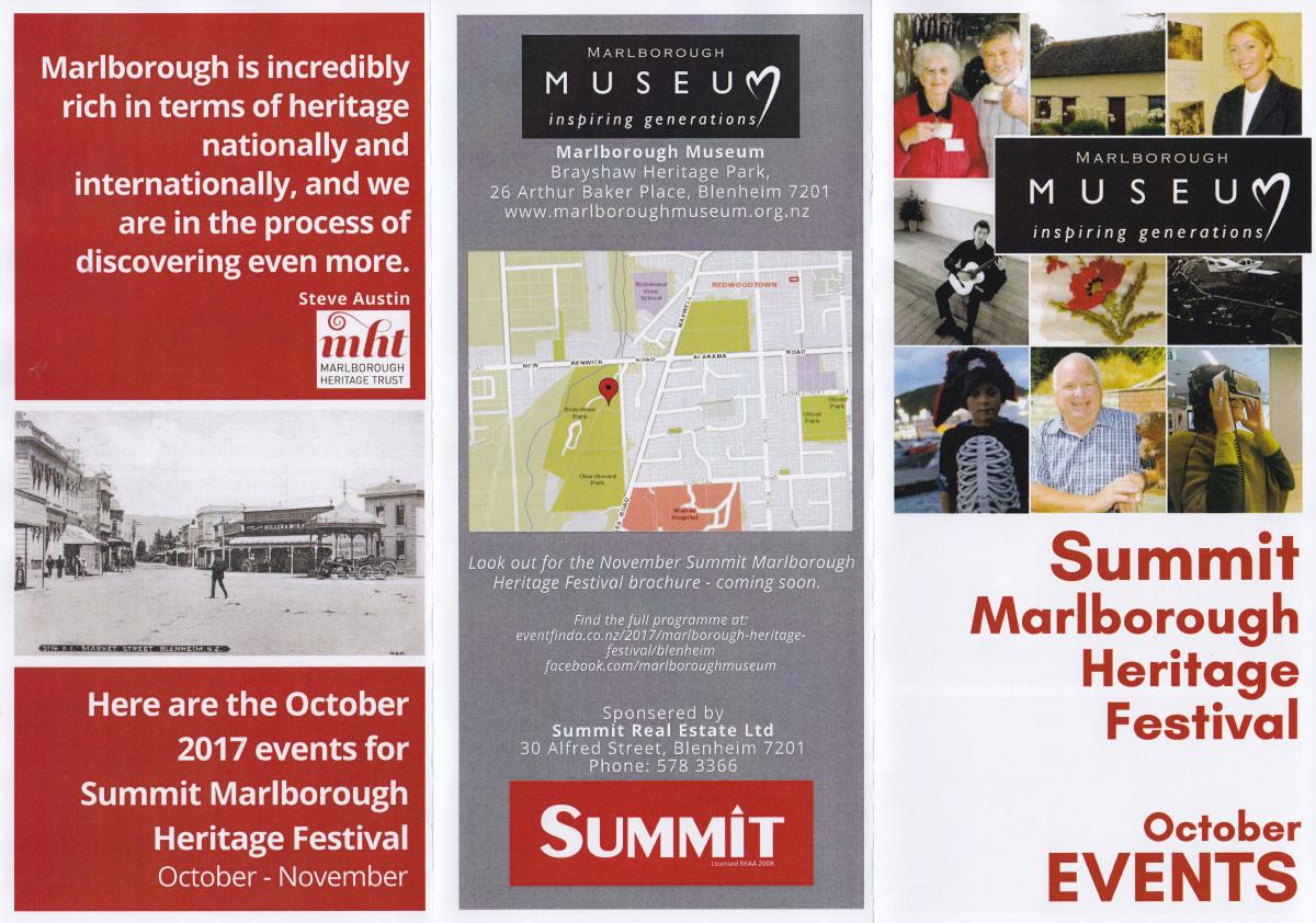 Check out the brochure attached for details of some of the great events we have coming up for the Summit Marlborough Heritage Festival. We would be delighted if you could join us for one, if not all of the events! Note that the events listed below are for October only - the November events brochure will be out in a couple of weeks.