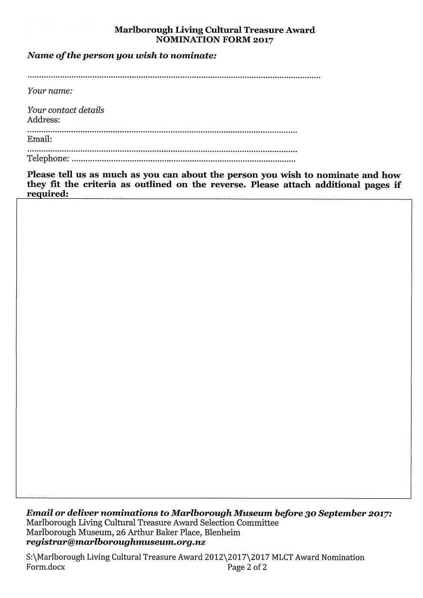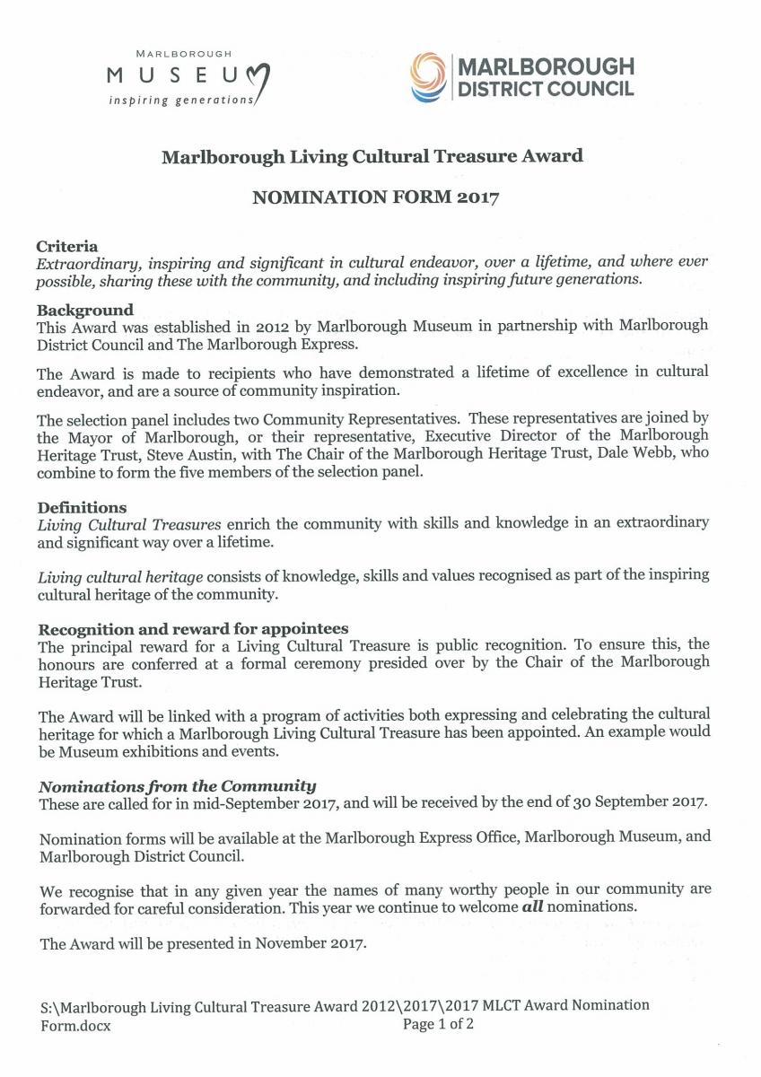 Calling for Marlborough Living Cultural Treasure Award nominations now! Closing 30 September, 2017.