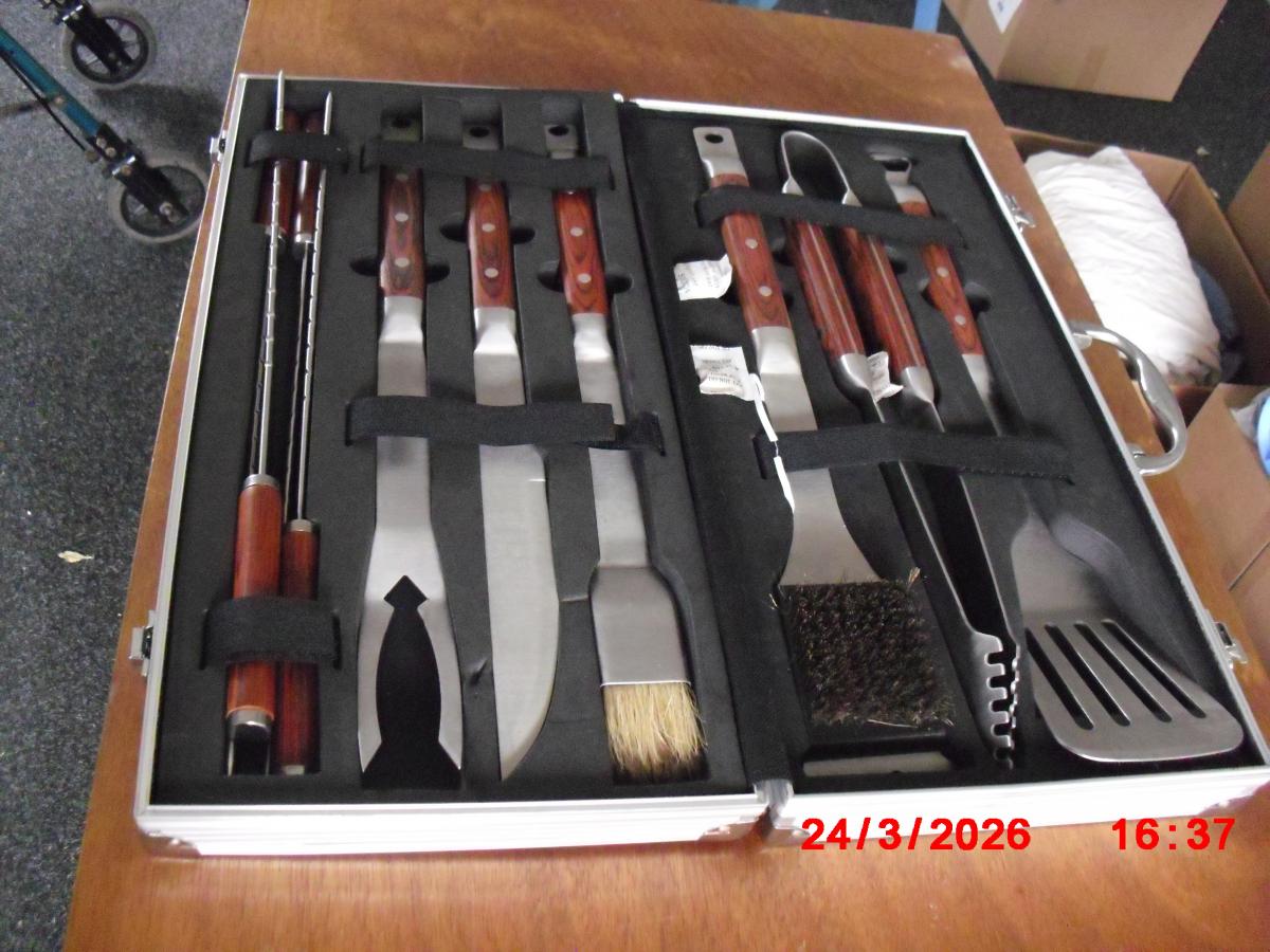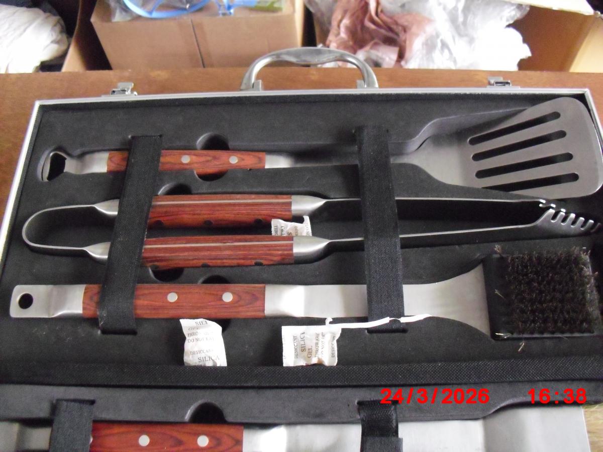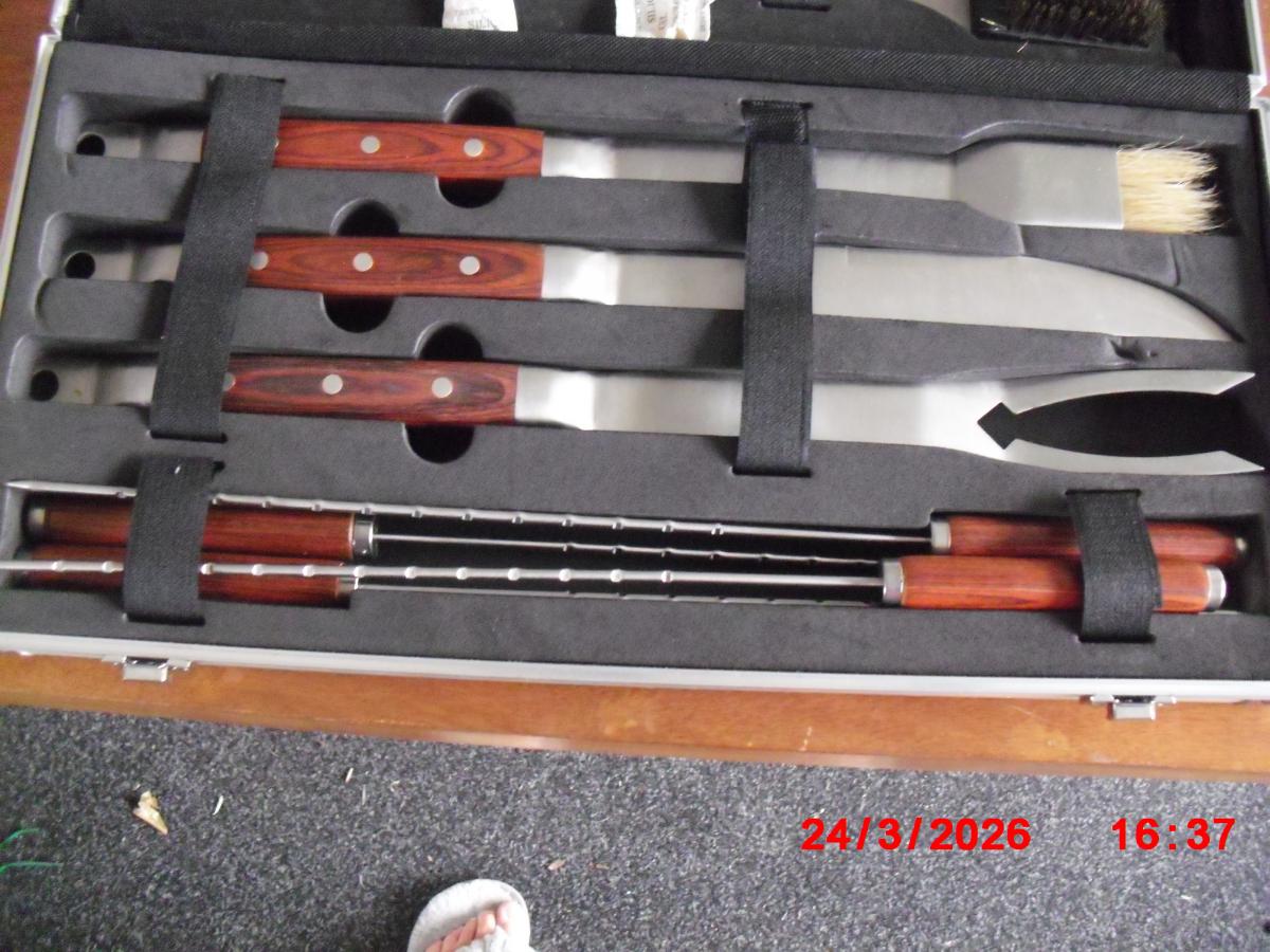 A nearly new (some bits only used once) BBQ tool set with wooden handles.
