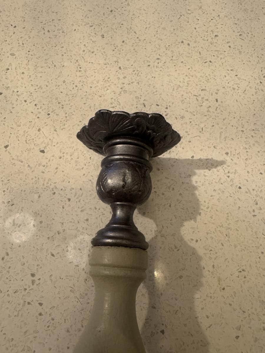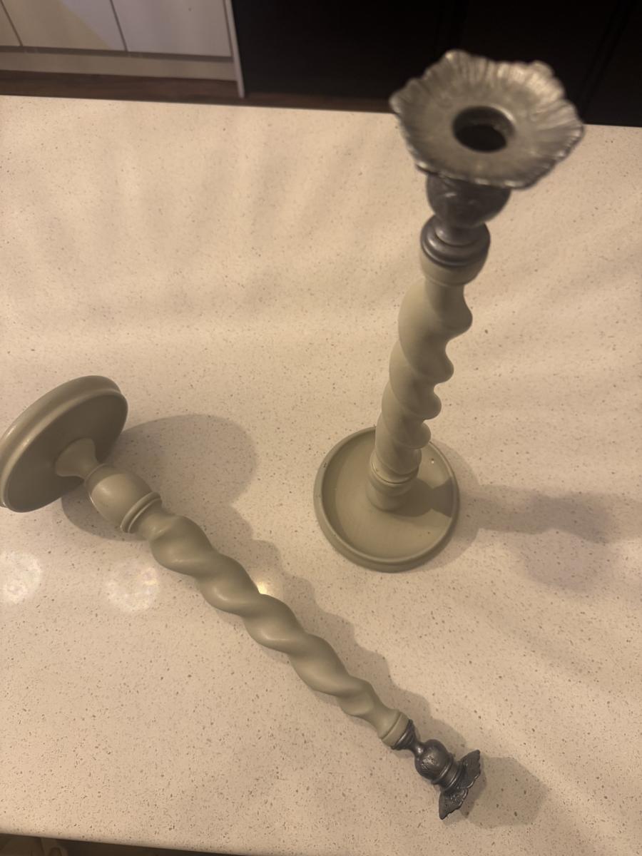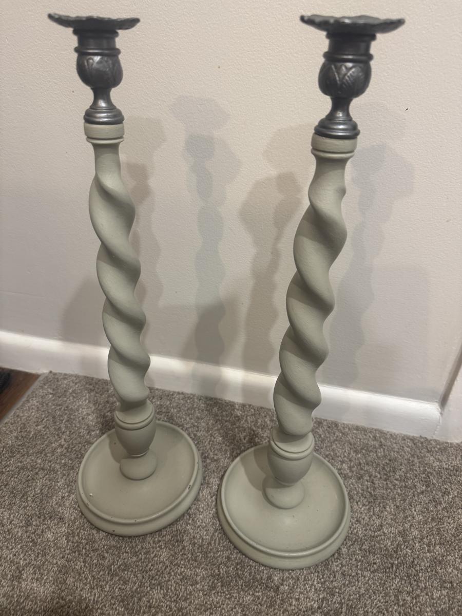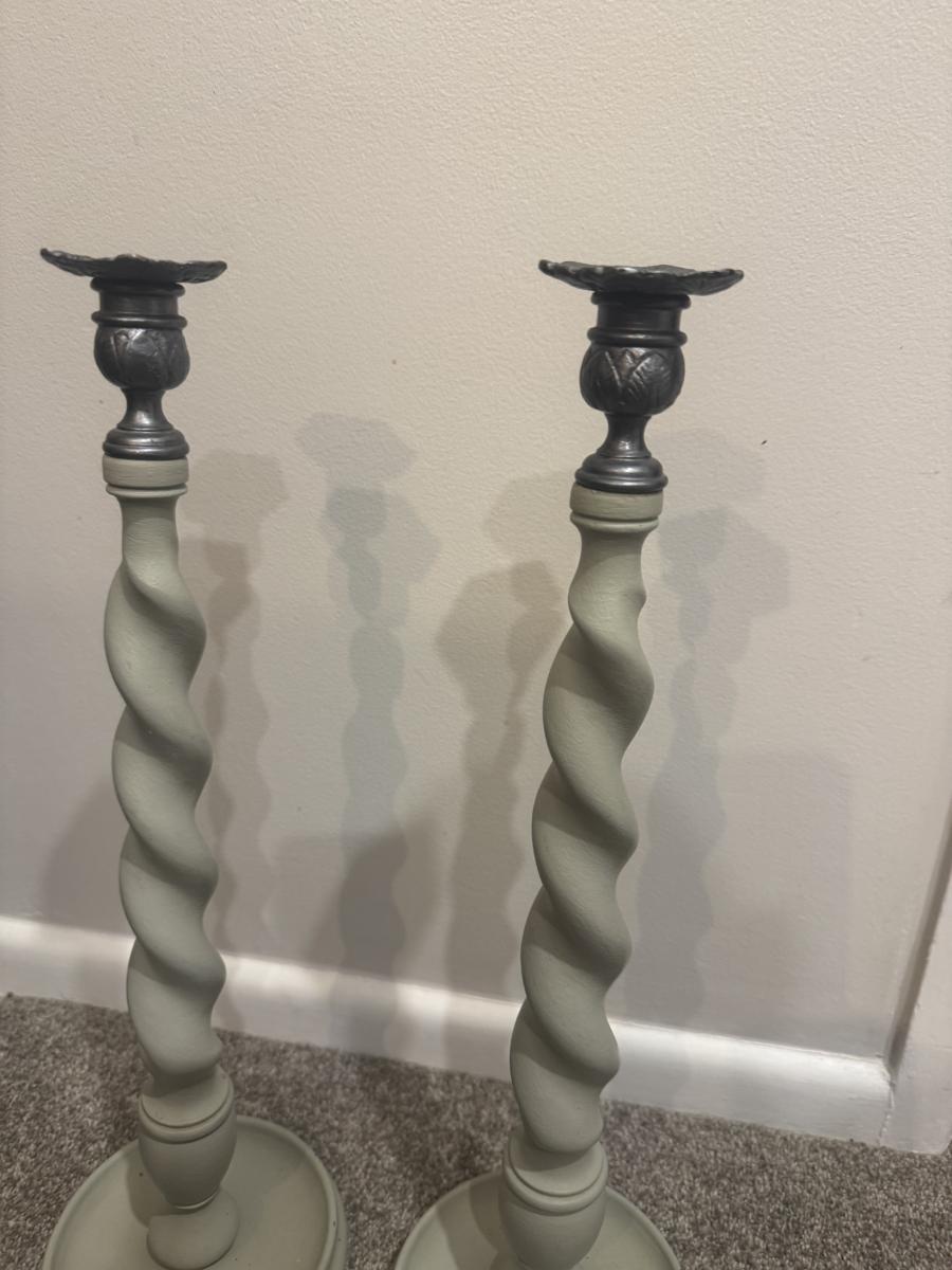 Two turned spiral candlesticks for sale tuned oak painted in shabby chick dove grey pewter fancy tops