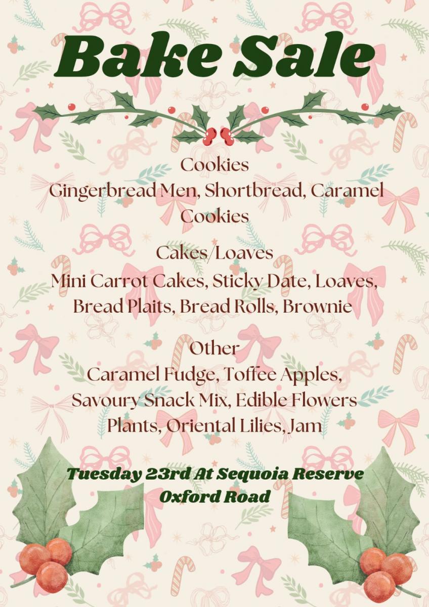 Pop along to our Xmas Bake sale from 10am - 12 noon Tuesday 23rd December at Sequoia Reserve on Oxford Rd.