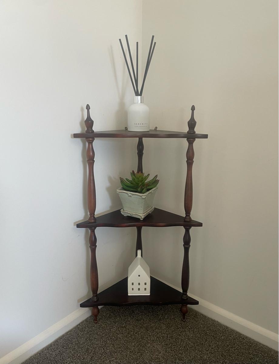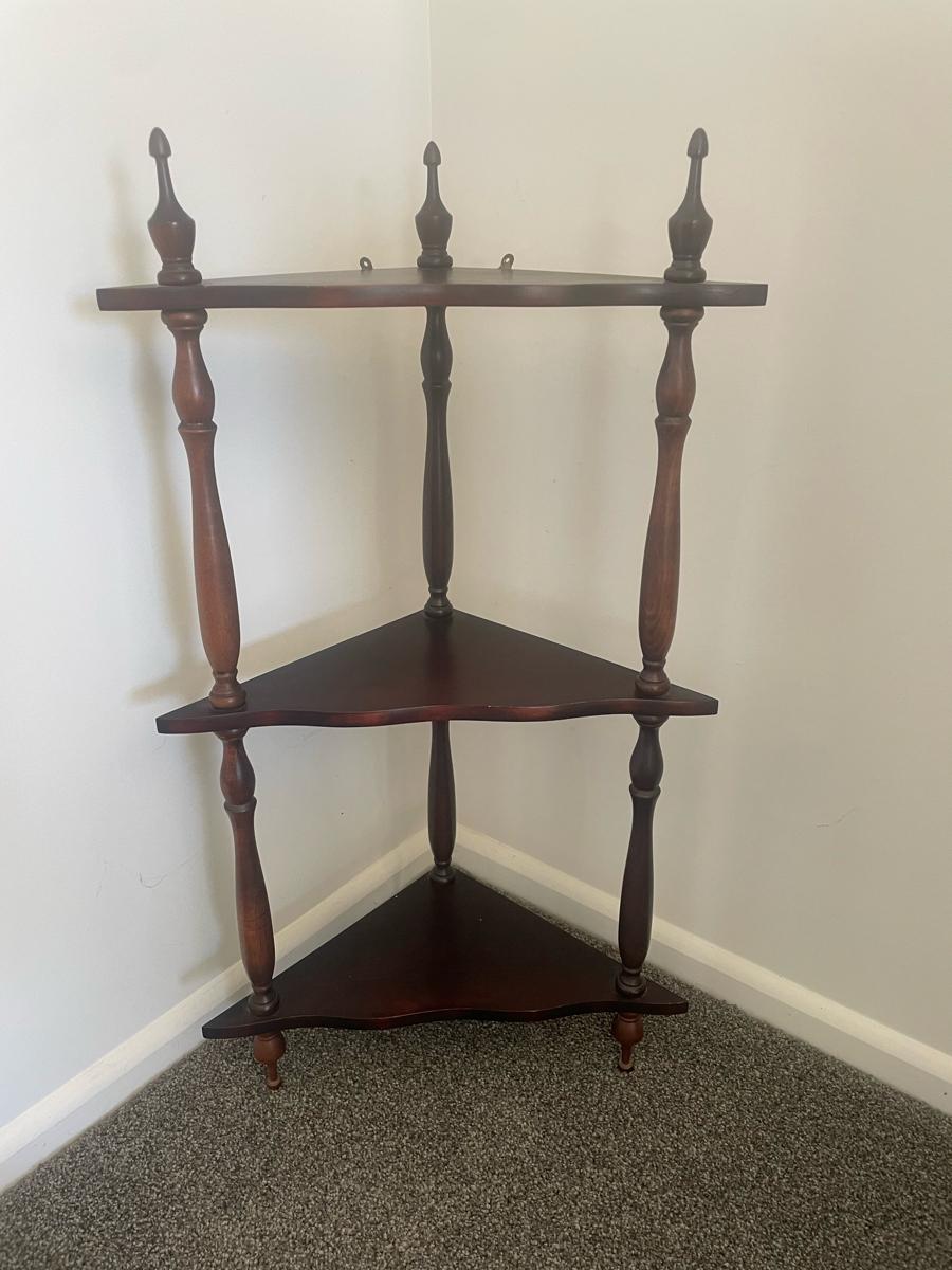 3 tier corner shelf to hang in corner on wall has hinges attached at top. This is small measures 62 high 37cm across and 20cm in depth. Ornaments not included just shown for display purposes. Would be cute painted white or fine as is. Pick up Brightwater or can drop to central Richmond.