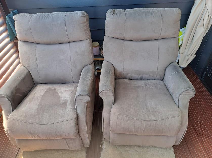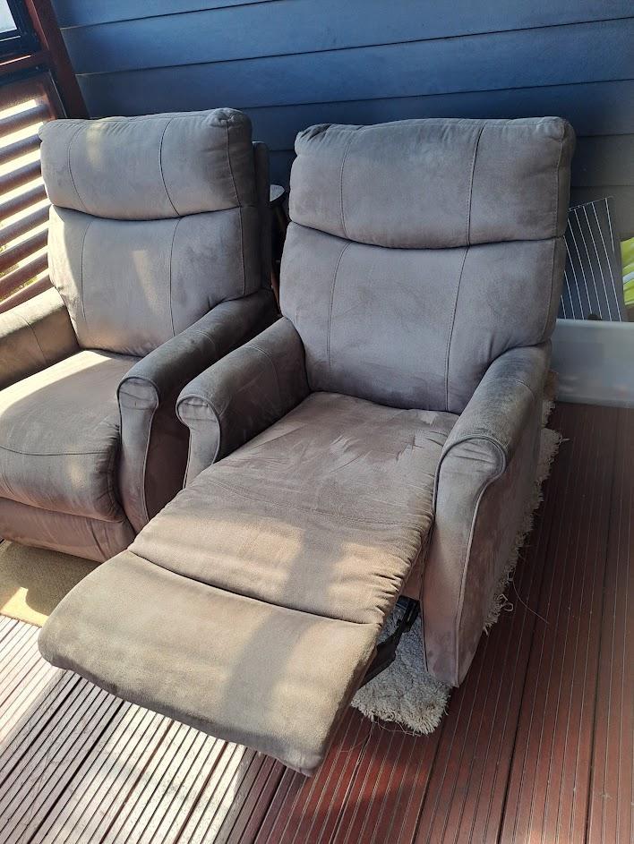 For sale: Pair of matching grey faux suede recliner chairs. Not electric - lever on side to enable reclining. Very good order - no marks or stains