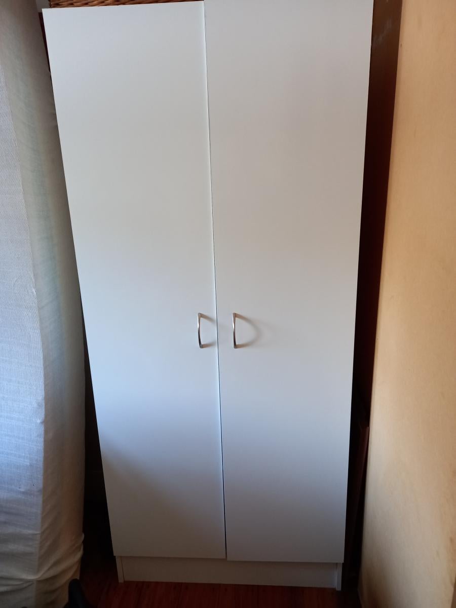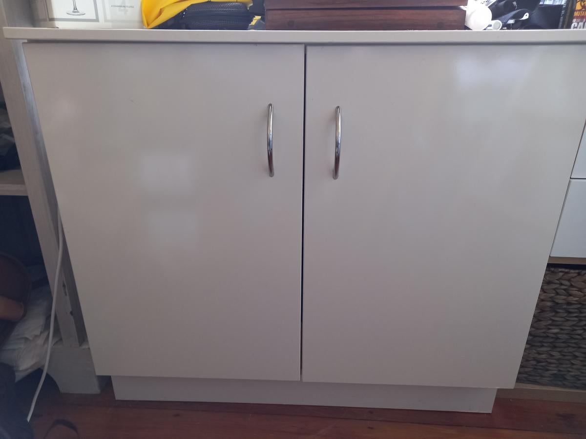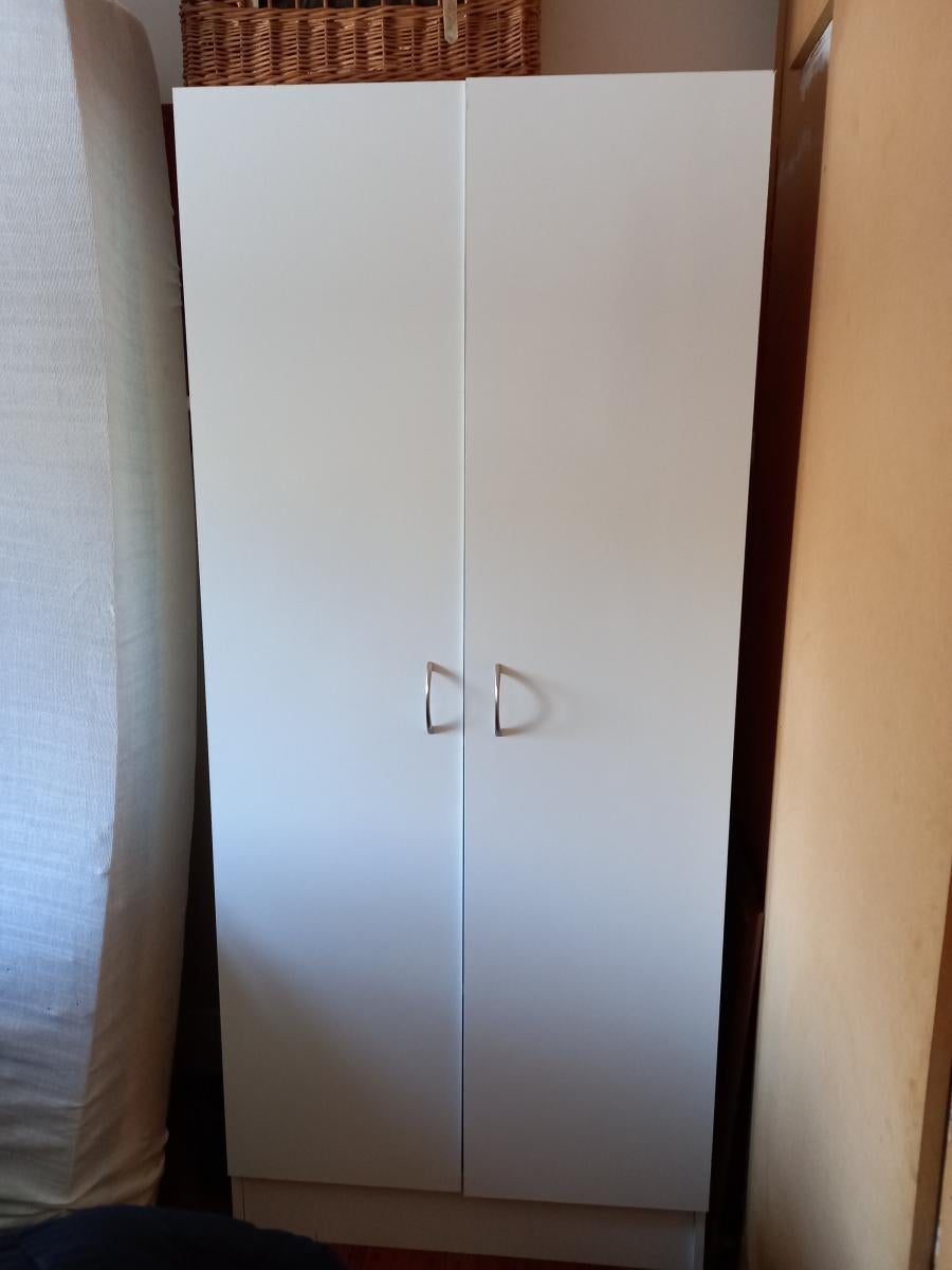 2 x white storage cupboards/wardrobes and 1 base cupboard, all in good condition