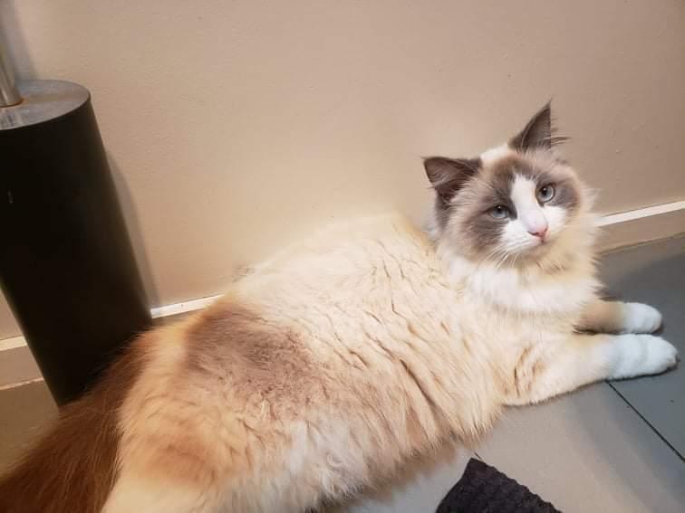 She is white, cream and brown with a white V on face. She is in season so maybe looking for a mate.