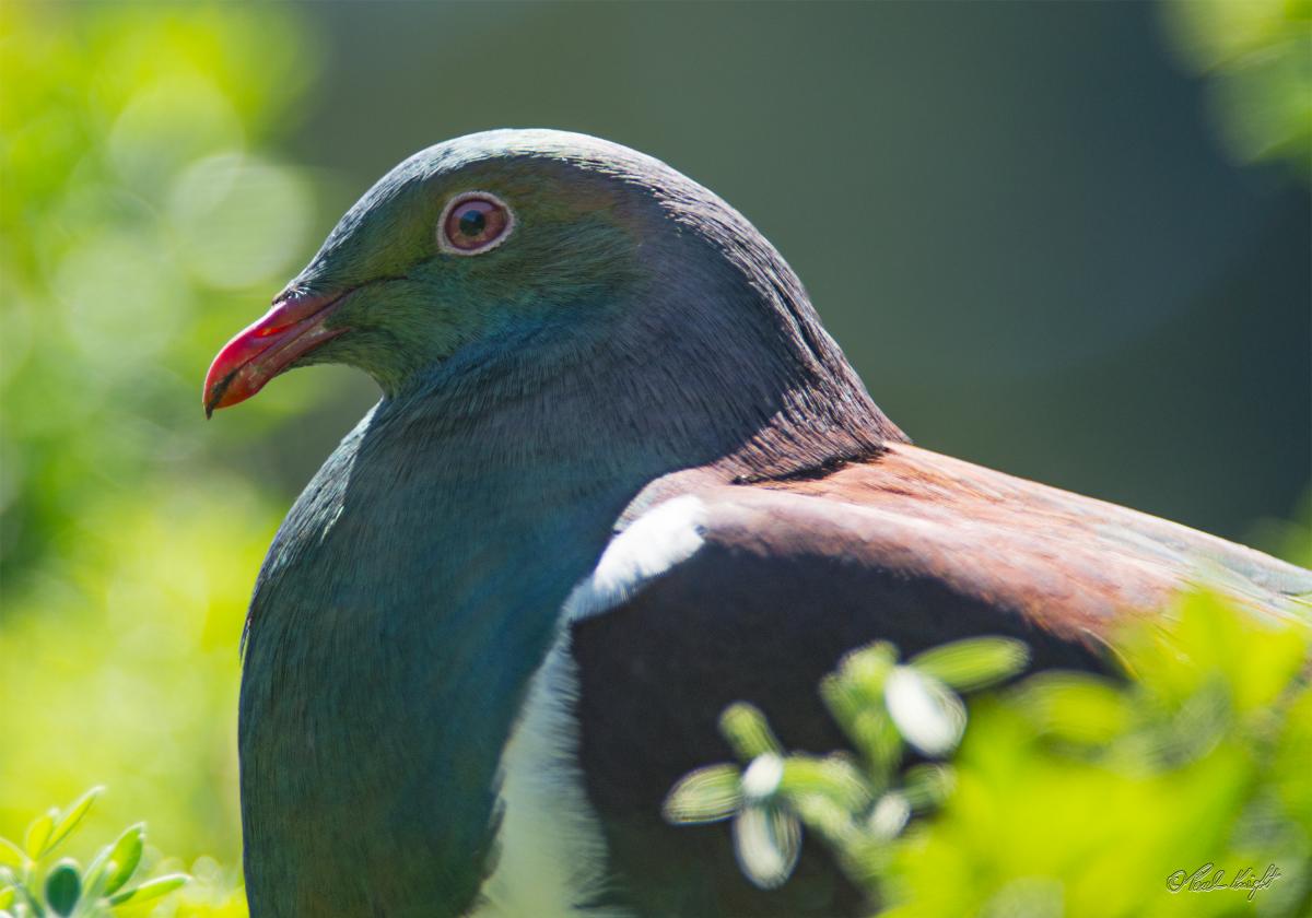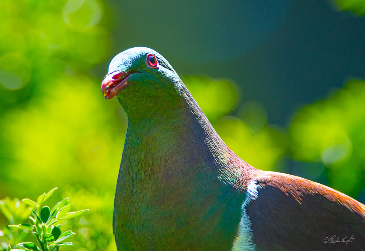 Kereru 0924. I had not realized that they have a white ring around their eyes, in common with the tauhou/silvereye