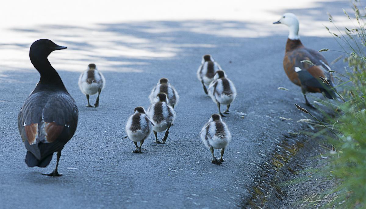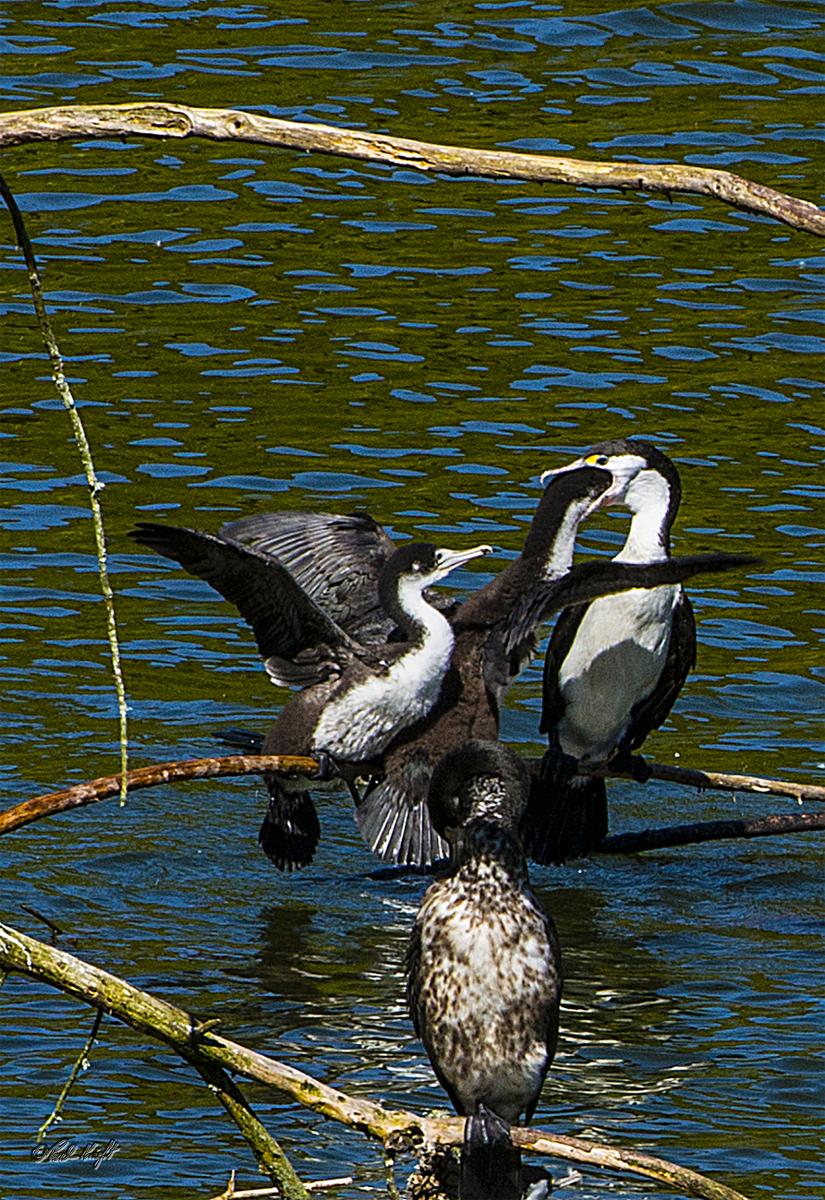 2 young ones pestering mum for food. She regurgitates and the young ones go down her throat for a feed. Pied Shags at Zealandia. ( See tomorrow's photo.)