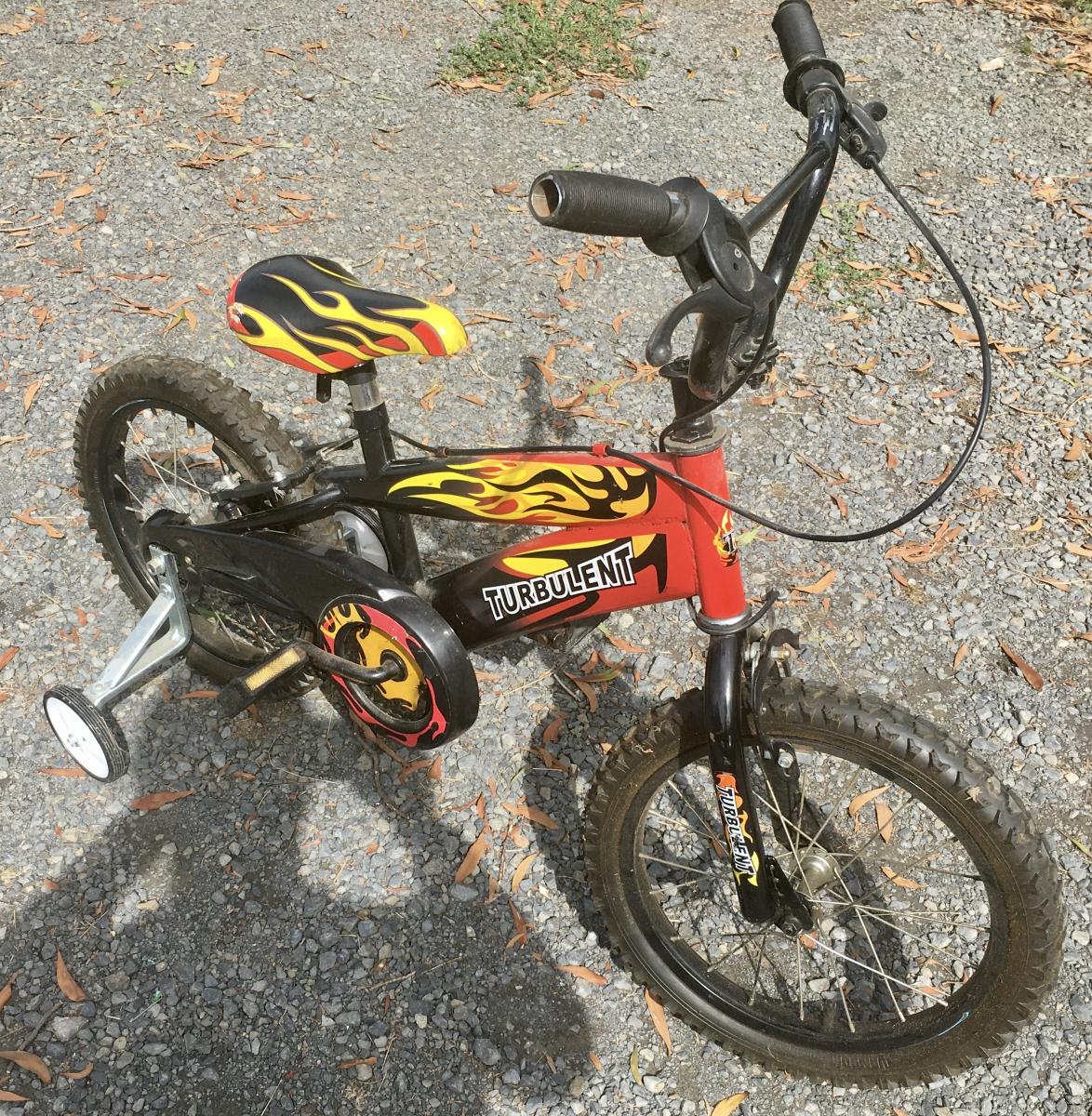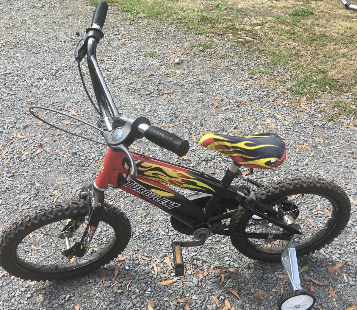 16" "Turbulent" bike suitable for 5-6 yr old boy but no reson why a girl couldn't have it as well. Has front and back brakes but front brakes need adjusting. In good condition and has trainer wheels that can be easily removed. Photos to follow