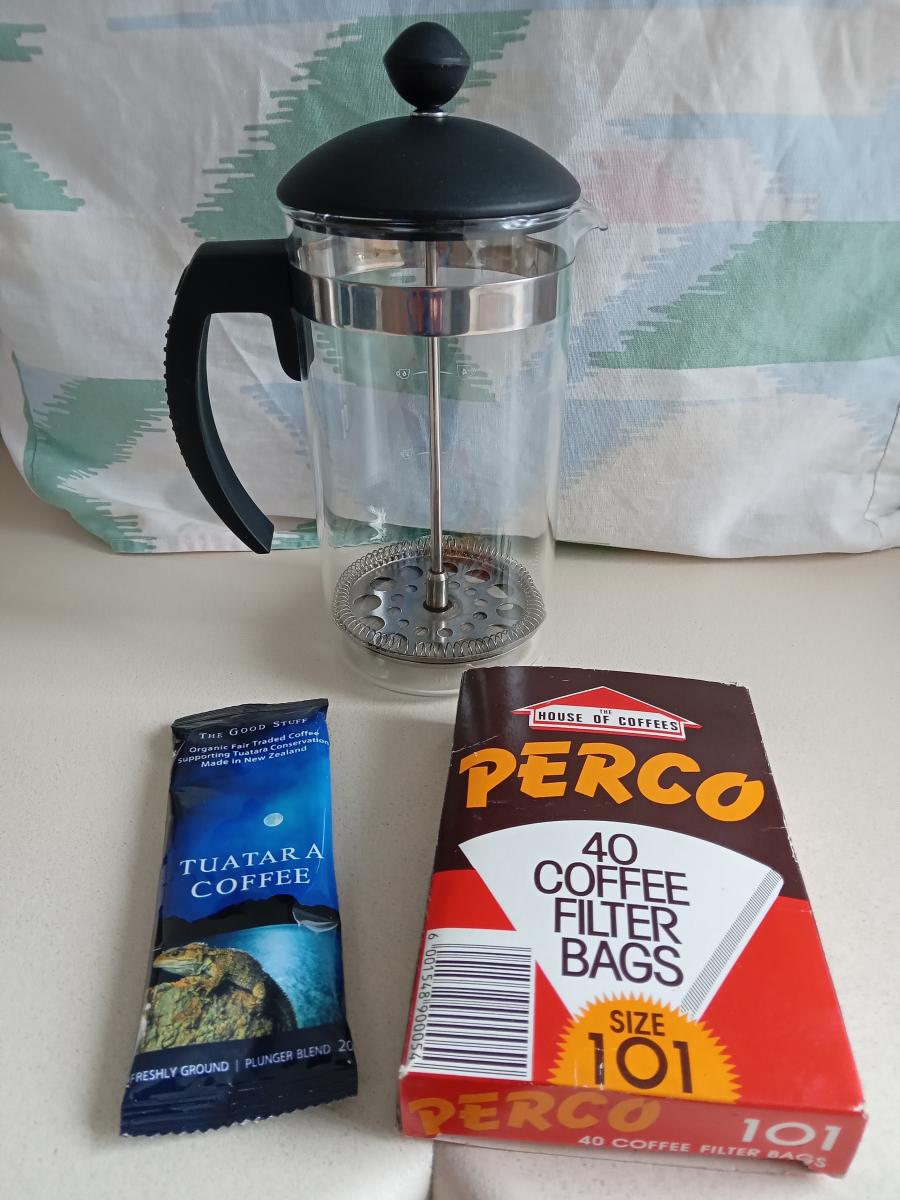 6 cup; includes a sachet of organic fine blend coffee. The coffee jug doesn't need filter bags but I have included a box for use, should you wish to use them on rough grounded coffee . Pick up Rangiora.