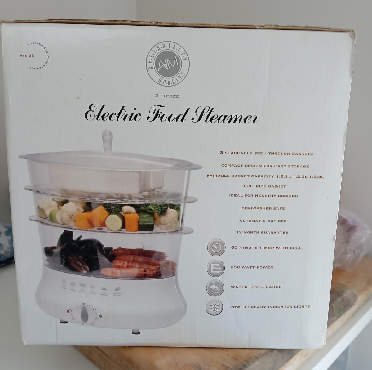 3 tiered electric food steamer, used but in excellent condition. Has 3 stackable see- through baskets. Ideal for meat, fish, vegetables & rice. A healthy way to cook. 60 minute timer bell. Power/food ready lights. Auto cut out. Dishwasher safe. Instruction booklet with cooking times. In … View more3 tiered electric food steamer, used but in excellent condition. Has 3 stackable see- through baskets. Ideal for meat, fish, vegetables & rice. A healthy way to cook. 60 minute timer bell. Power/food ready lights. Auto cut out. Dishwasher safe. Instruction booklet with cooking times. In original box. Pick up Rangiora.