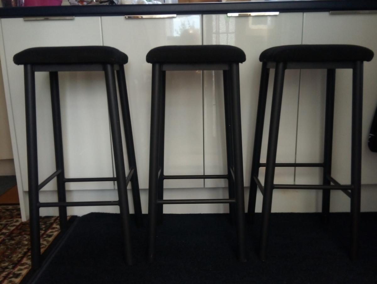 Set of 3 kitchen or bar stools, little used and in very good condition. Sturdy matt black metal frames with upholstered seats, 730mm tall. Price for the set includes free delivery in Tauranga area. Call Paul on 021 106 5088.
