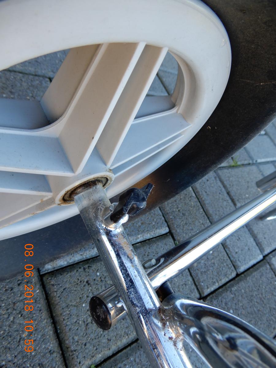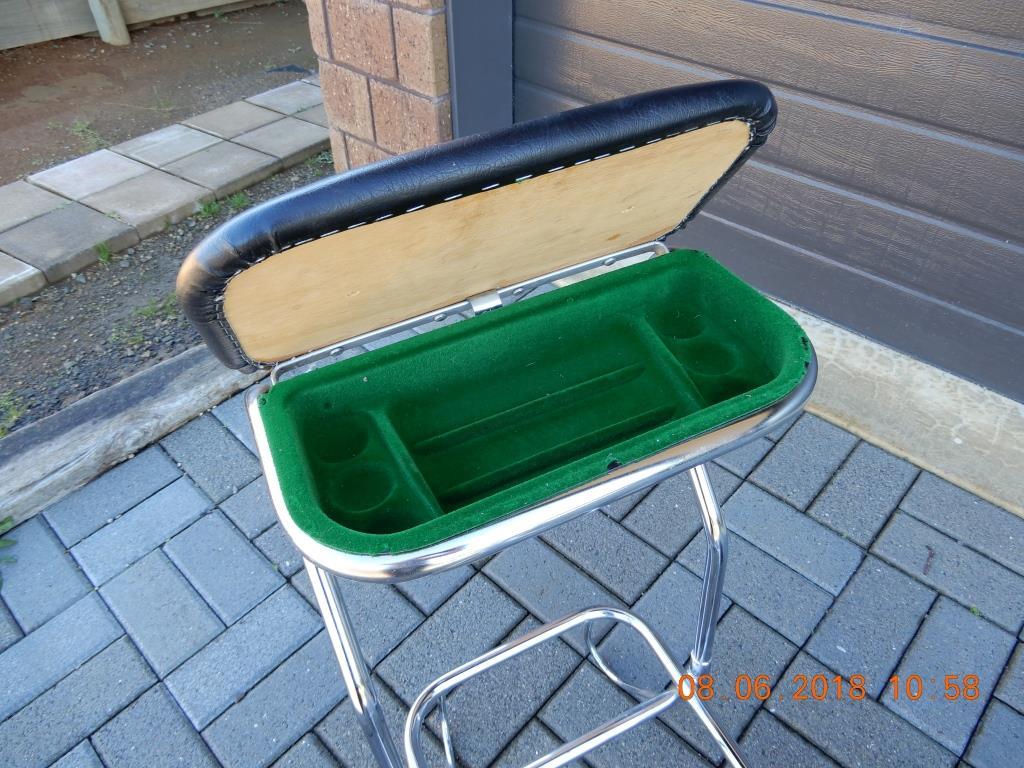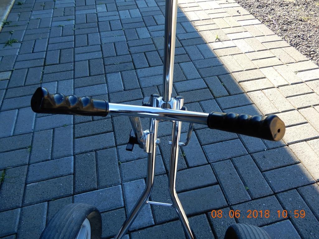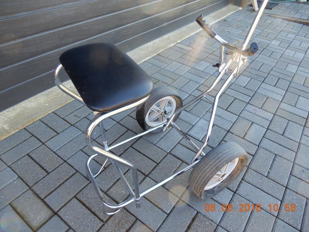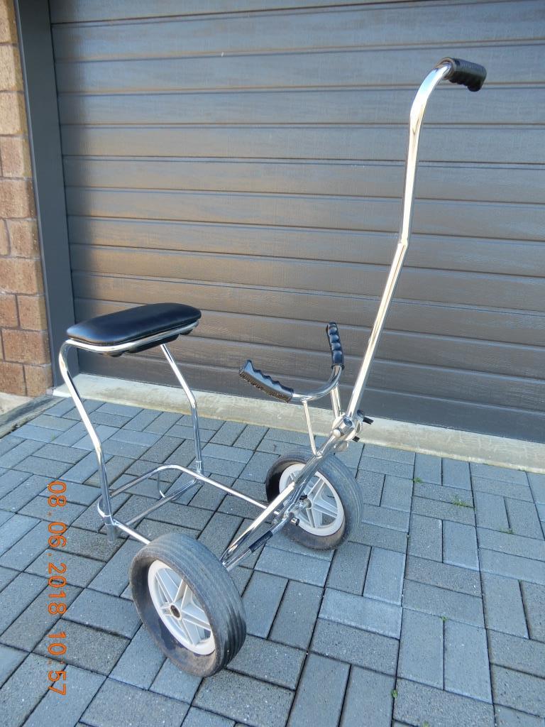 SOLD - Golf Trundler chrome plated. Has removable seat and storage for golfballs etc. Can be folded down for transport. In good condition. Can be viewed by arrangement.