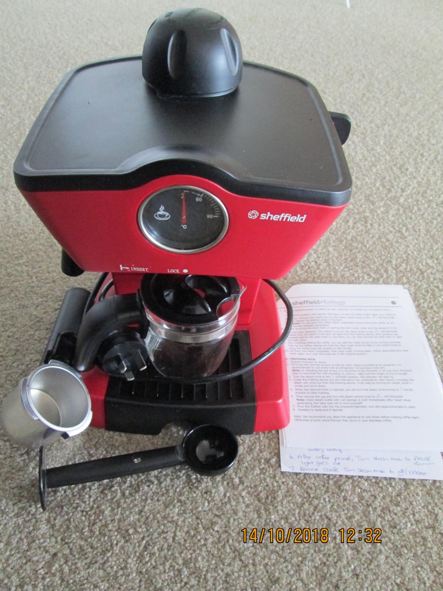 For sale-red coffee maker purchased November 2017. Has instructions with it and contains glass carafe with water level, steel mesh, metal funnel attachment, measurer and tamper. removable and washable drip tray for easy cleaning. Milk frother function. Says 4 Cup but I found only 2 depending upon … View moreFor sale-red coffee maker purchased November 2017. Has instructions with it and contains glass carafe with water level, steel mesh, metal funnel attachment, measurer and tamper. removable and washable drip tray for easy cleaning. Milk frother function. Says 4 Cup but I found only 2 depending upon the size of the coffee you want. Paid $49.99 on special for it. As new condition.