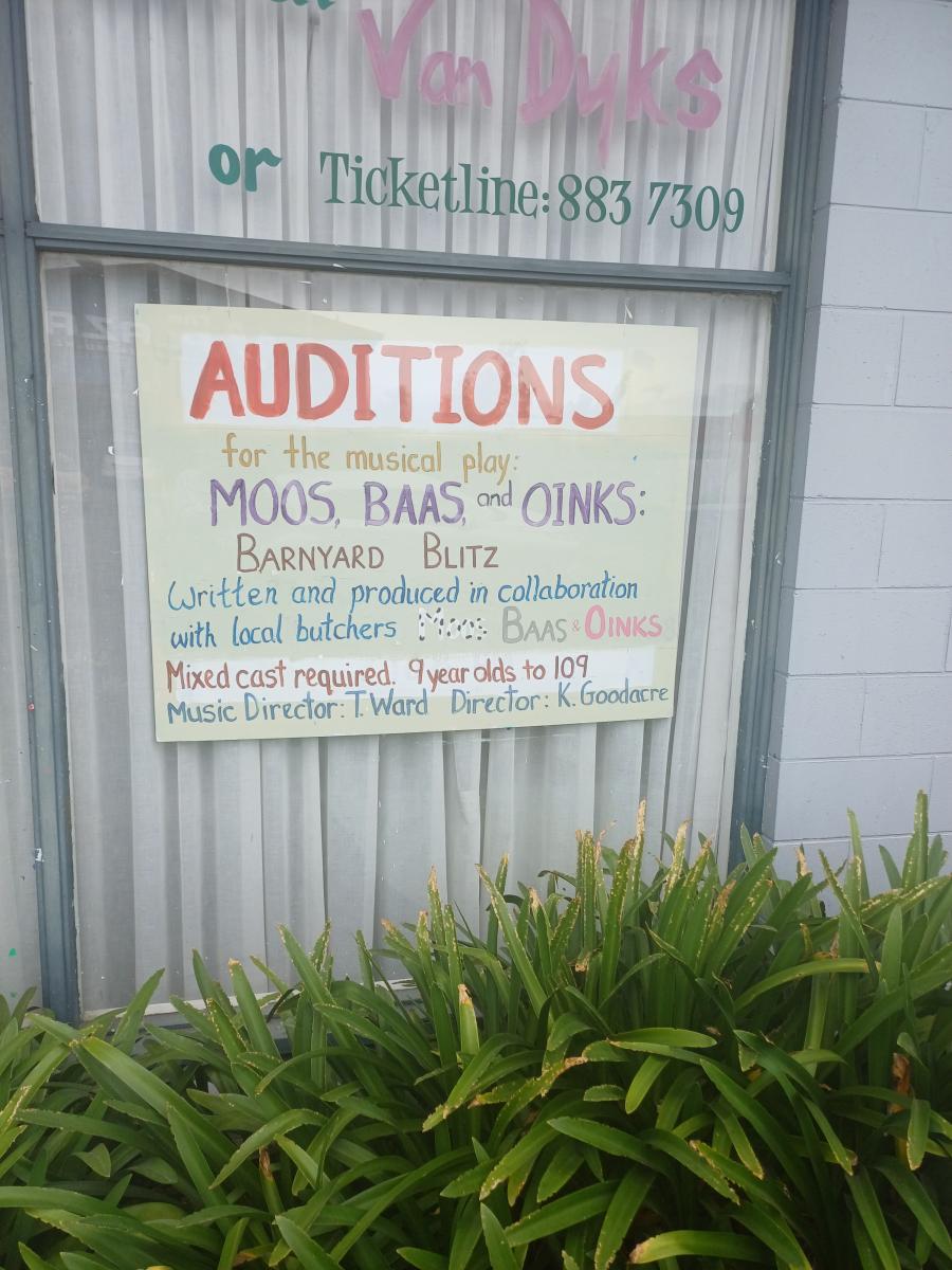Auditions for the next production of the year in collaboration withMoos Baas and oinks Barnyard Blitz