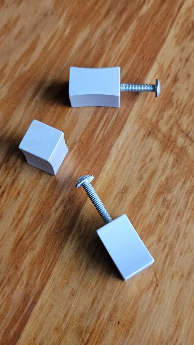 27 small cupboard doir handles with 22 matching screws. 20 mm x 12 mm.