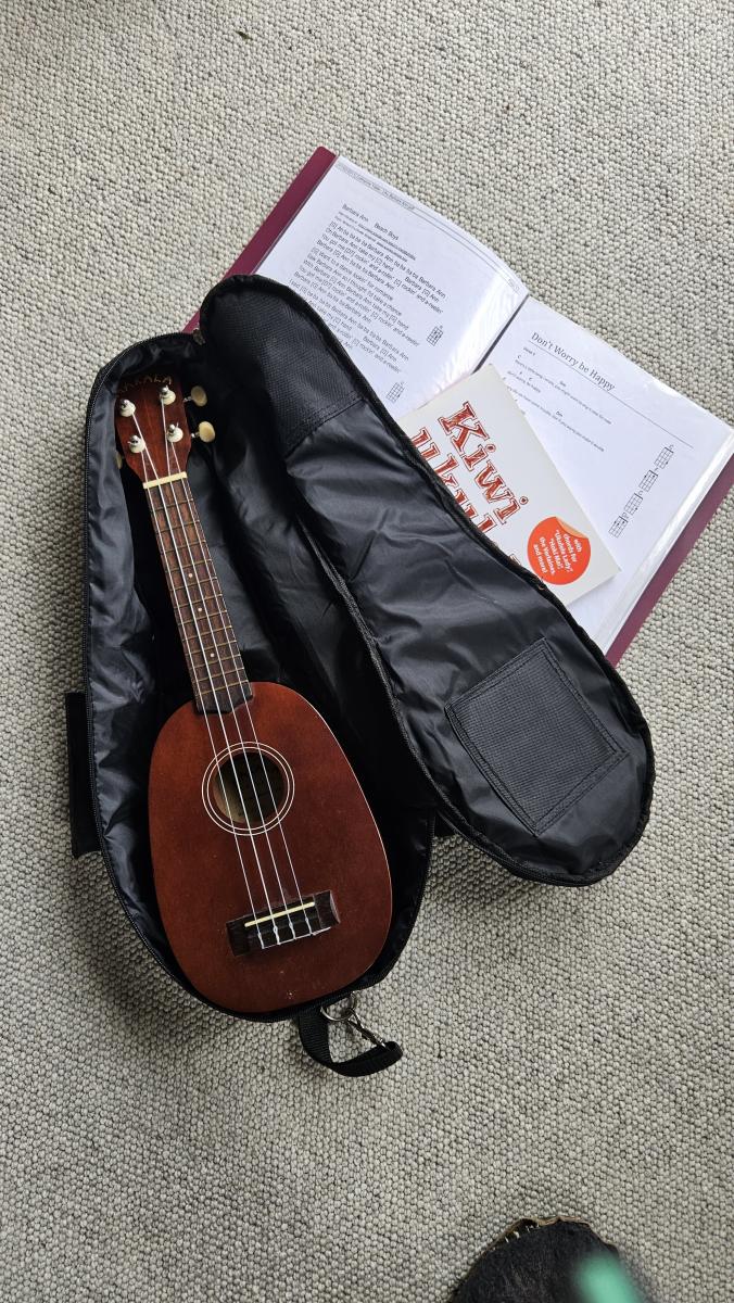 Very small ukulele, excellent condition. With case (dusty) and assorted neginner music. A great kid's starter pressie.