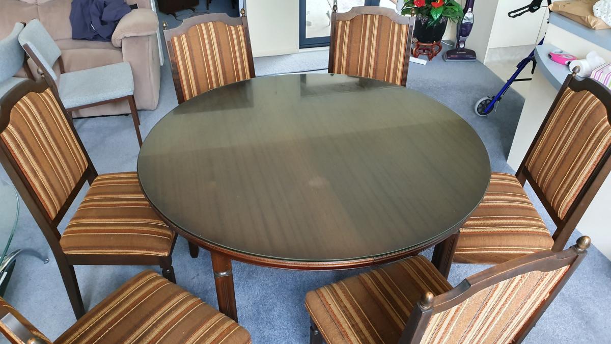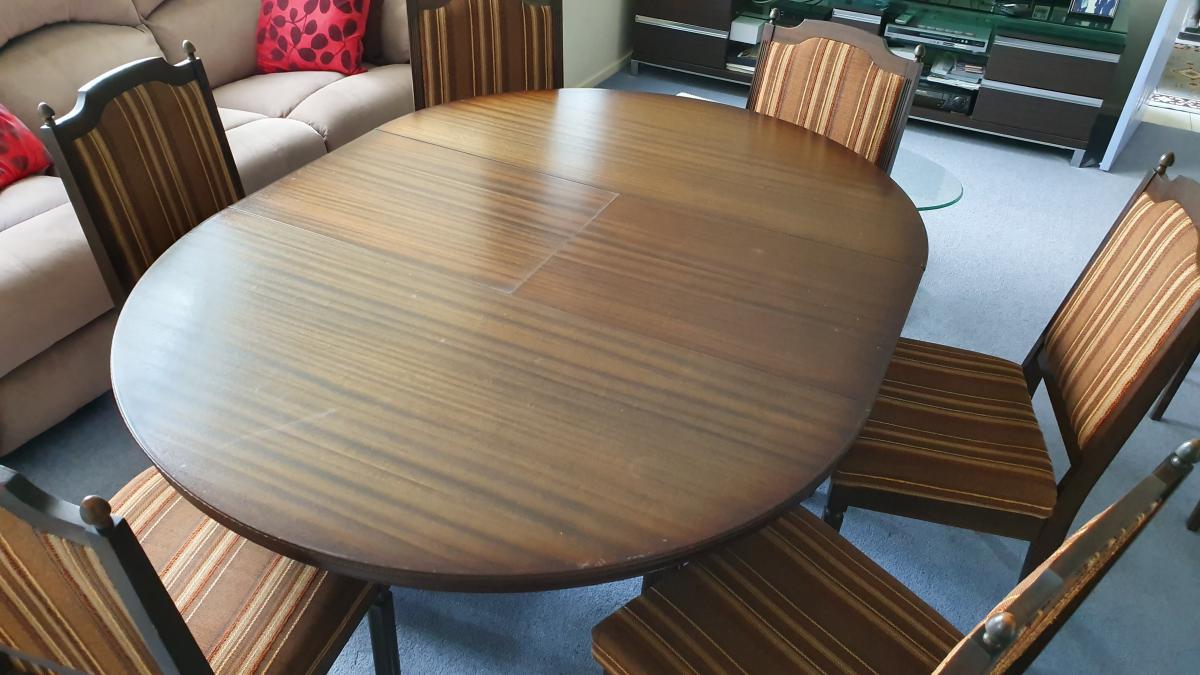 Retro dining table and 5 chairs, not 6 as in the photo as 1 broke when we were shifting. This is an extendable table and comes with a glass top and lazy suzy