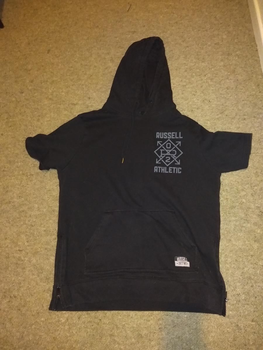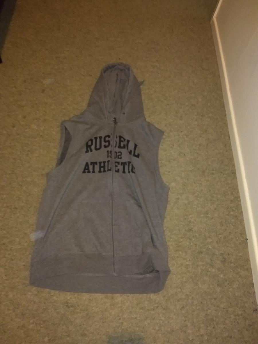 Two Russell Athletic sleeveless Hoodies size L. One zips up. Both in good condition.