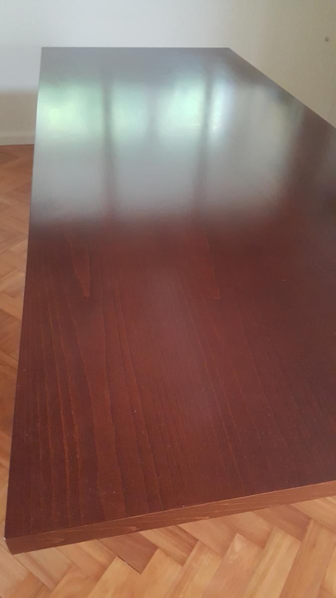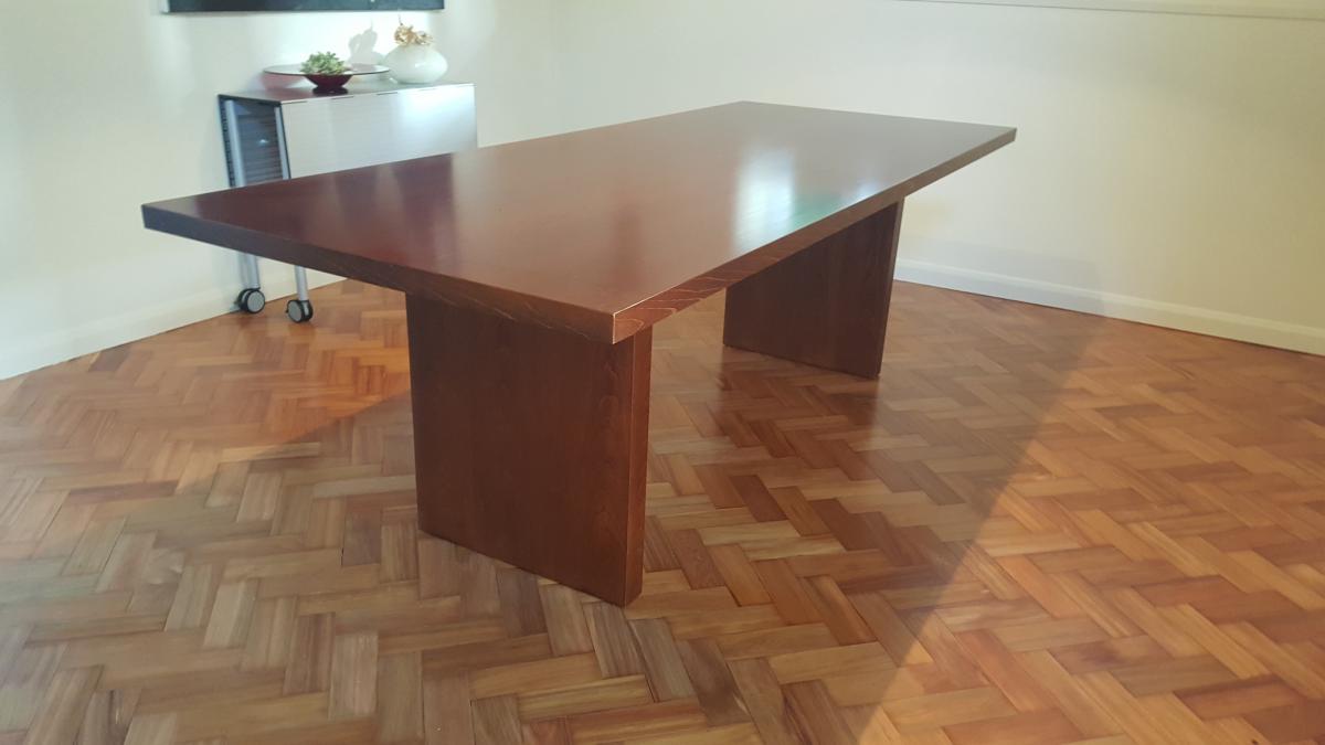 Contemporary custom built table. Ash with dark stain. 950 x 2300, sits 8-10 people. Legs removable for transport. Very solid construction, suitable for dancing on during particularly lively dinner parties! some minor blemishes.