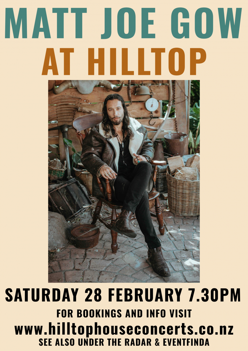 Today Saturday 7pm for 7.30 Start. Americana/Alt.Country artist Matt grew up in Dunedin but these days calls the road his home, and over his impressive career has toured with Grant Lee Phillips, Chris Isaak and the late great Justin Townes Earle. Backed subtly by a finger picked guitar figure, his voice will mesmerise you and allow you to slip away from whatever it was you were doing. His musical style is influenced by folk, blues, and soulful rock while being firmly rooted in country. Come along for a lovely evening concert. www.hilltophouseconcerts.co.nz...... ... All details sent with confirmation email.