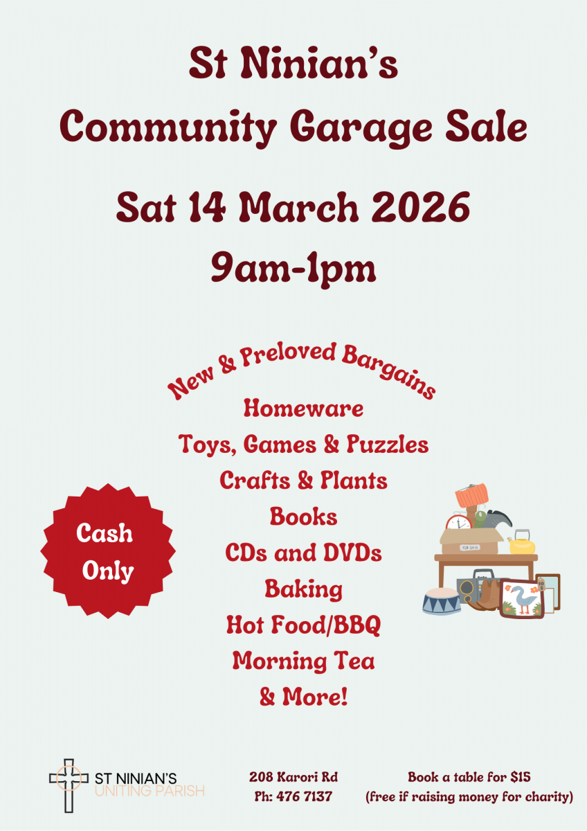Our Community Garage Sale at St Ninian’s (208 Karori Road) is on Saturday 14 March, 9am–1pm!