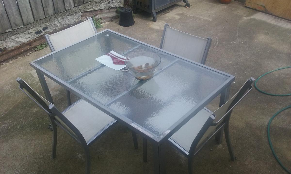 1. Glass topped table (150/90/70cm) with 4 matching chairs