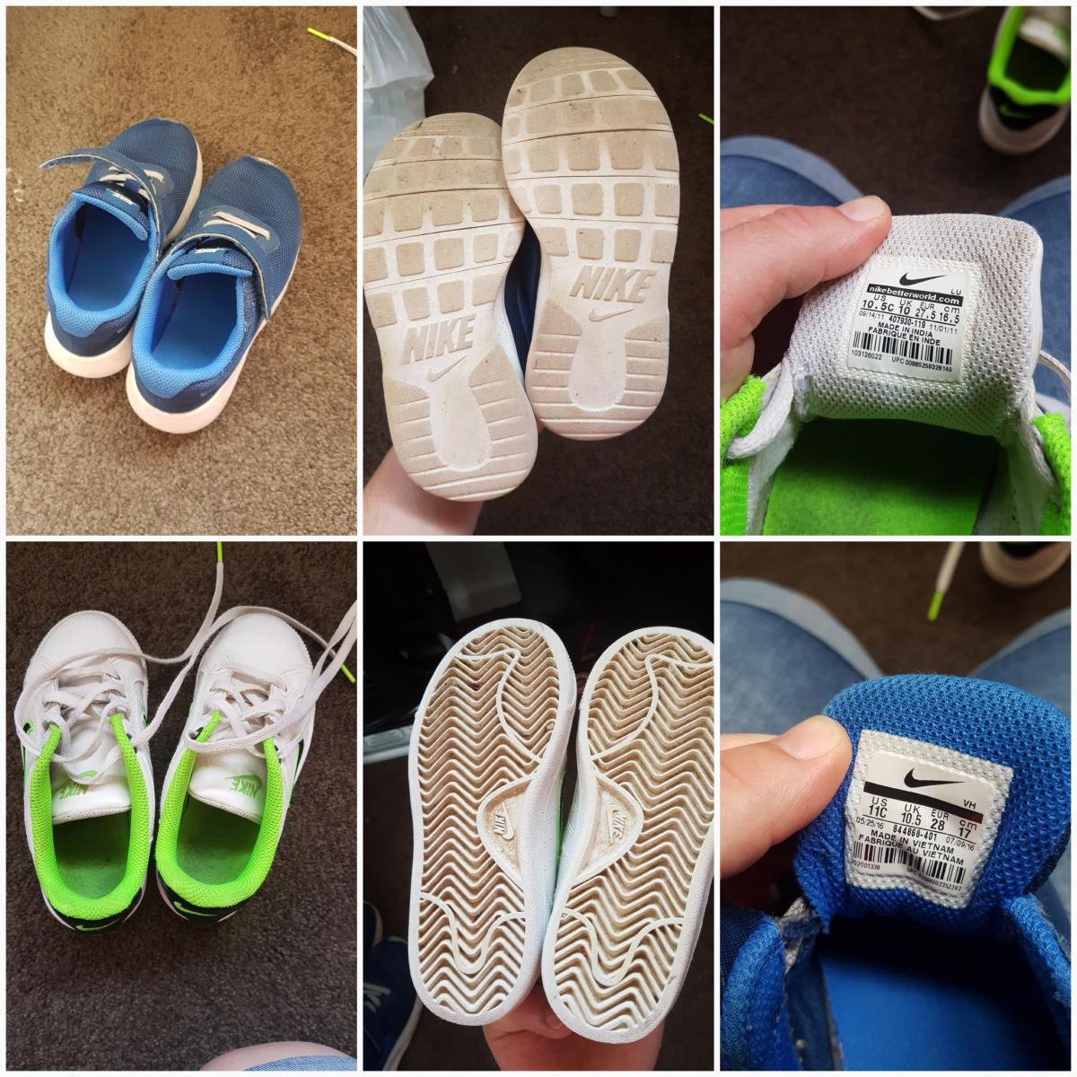 2 pairs of nike shoes. Blue pair are US 11 and white pair are US 10.5. White pair seem to be a bigger fit than blue. Both still in excellent second hand condition. Selling as don't fit my son.