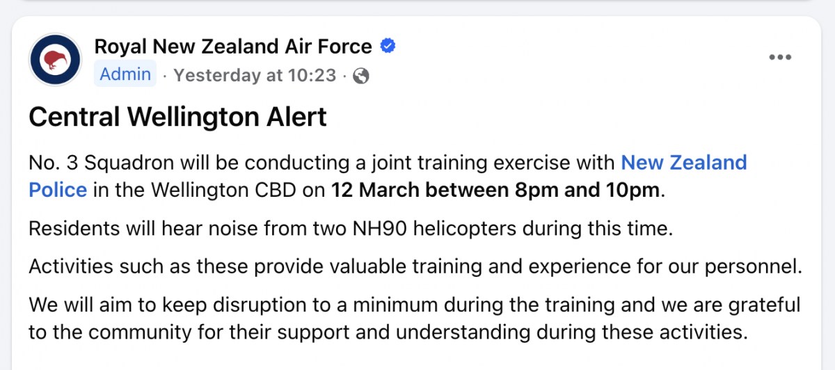 The NZDF and Police are running night-time training over the CBD tonight (Thursday) - there might be some helicopter noise similar to last night