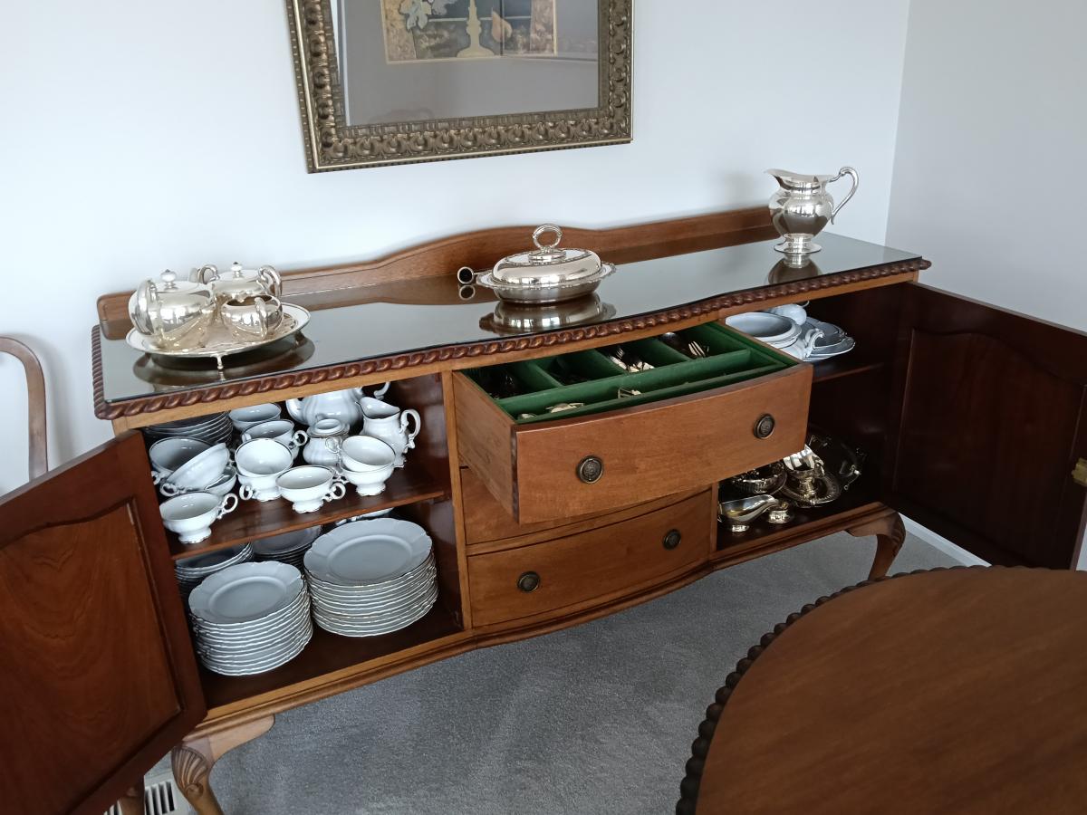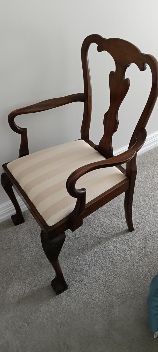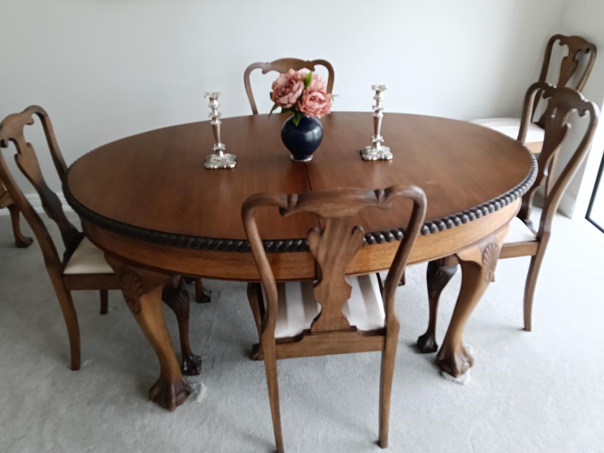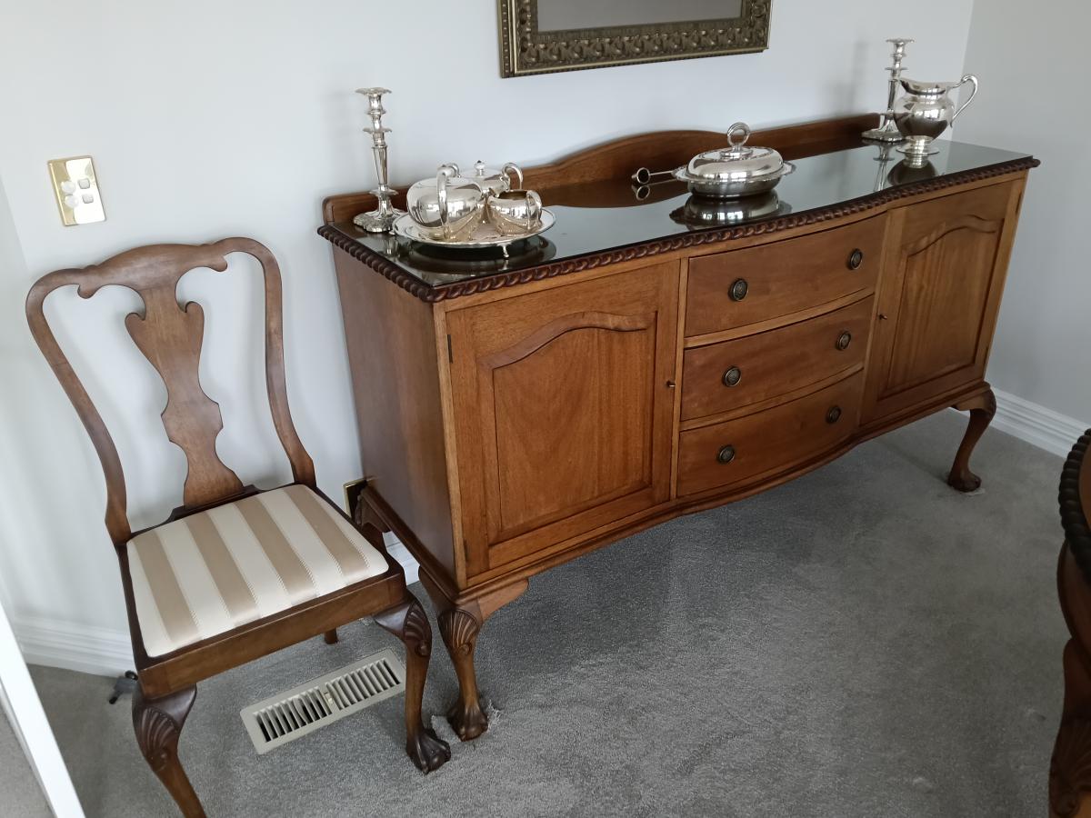 Mahogany (x Harrods). Ball and claw feet. Table 165 cmx120 cm has two inserts of 32cms, making 3 lengths of table-165 cm,197 cm, 229 cm. 6 chairs and 2 carvers. Sideboard has glass top, cutlery insert in top drawer; cupboards key locked. Seats re padded and recovered. Excellent condition. Table has… View moreMahogany (x Harrods). Ball and claw feet. Table 165 cmx120 cm has two inserts of 32cms, making 3 lengths of table-165 cm,197 cm, 229 cm. 6 chairs and 2 carvers. Sideboard has glass top, cutlery insert in top drawer; cupboards key locked. Seats re padded and recovered. Excellent condition. Table has small damage. Can buy separately. View now-Available for pickup April. Price for full set $600 - table, inserts and 8 chairs $350, buffet/ sideboard $250 negotiable.