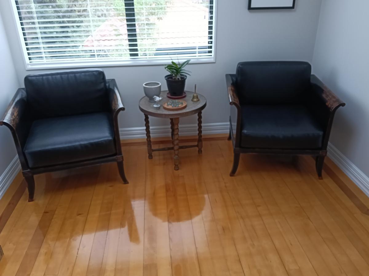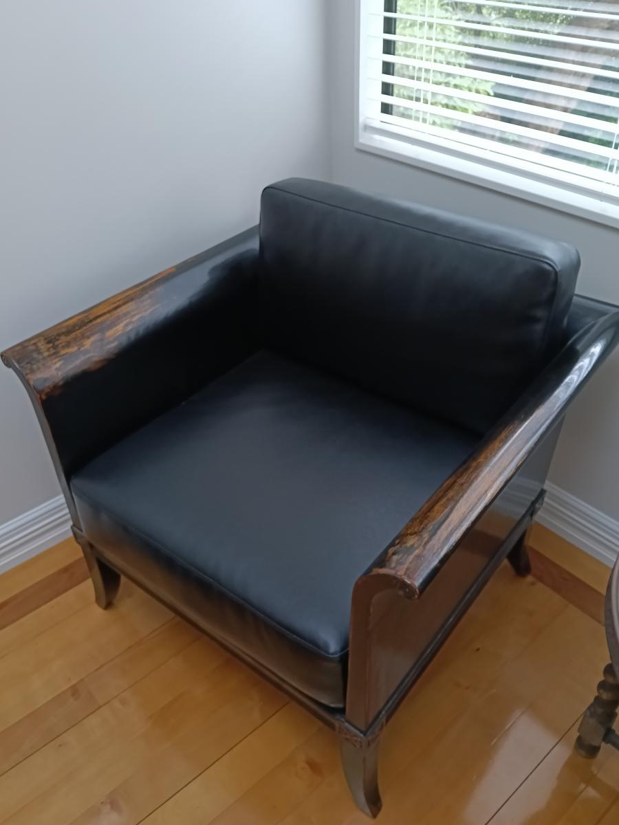 2 comfortable wooden chairs, big enough to curl up in. Recently squabs recovered( cost $1000) in high quality leather. Can view now, available April. $400 each or $650 for two.