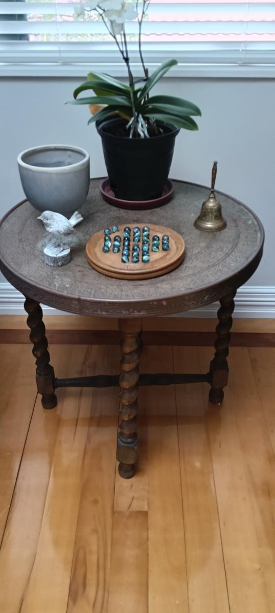 57 cms high, 60 cms diameter. Top needs rebrassing or ideal for painting.